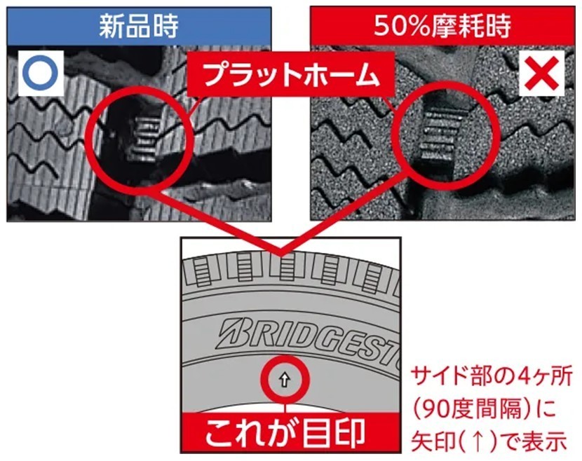 冬タイヤの溝深さが50%になったことを知らせるサインとして、プラットホームがあります。