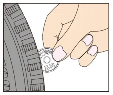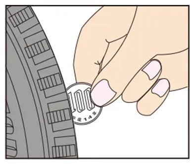 5円玉をタイヤの溝に垂直に差し込んで『五』の文字の三画目の横線が見えたら、