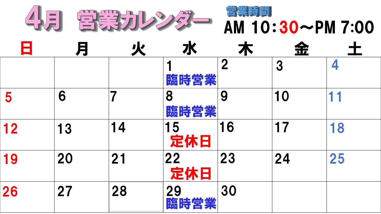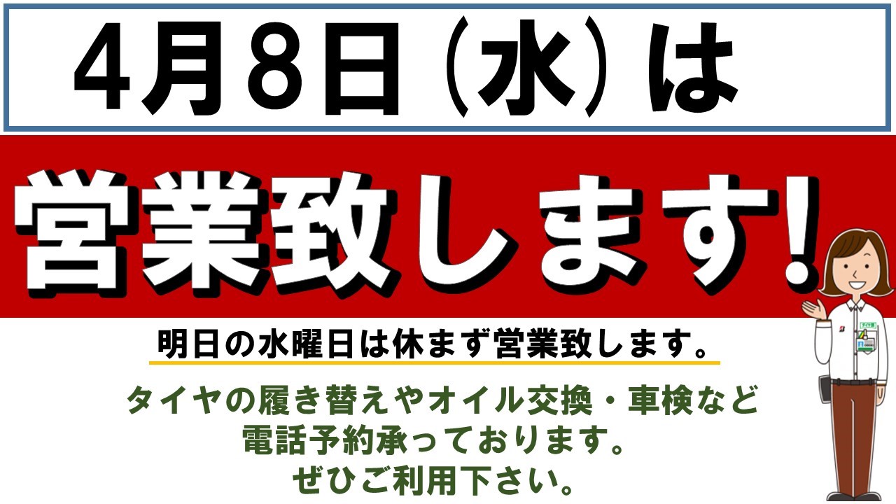明日4月8日は水曜日ですが営業致します!