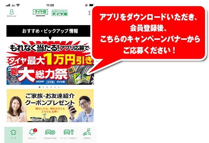 タイヤ館アプリをダウンロードして、