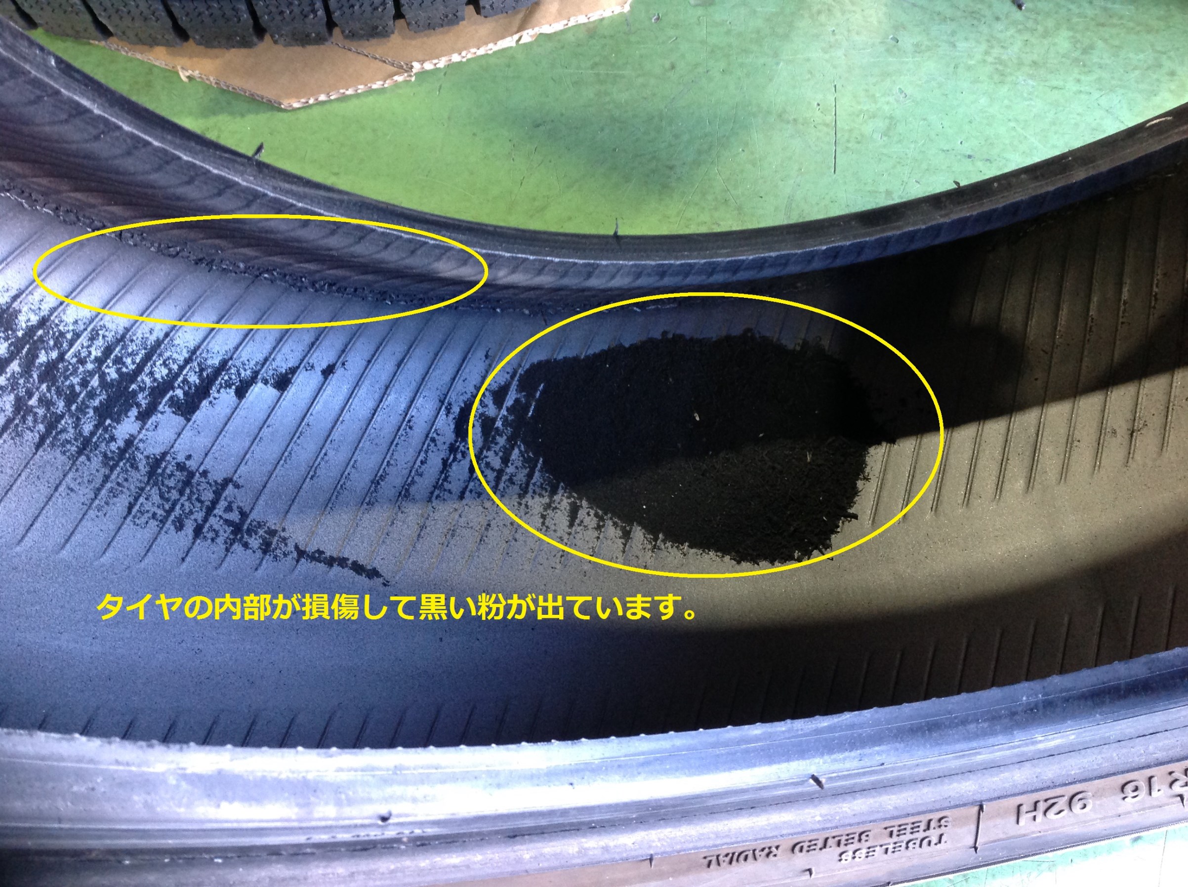 タイヤの内側が損傷していて、黒い粉がたくさん出ている場合があります。このような状態のタイヤを修理しても、タイヤ自体の強度が保たれていないため、最悪バーストになってしまうことがあります。