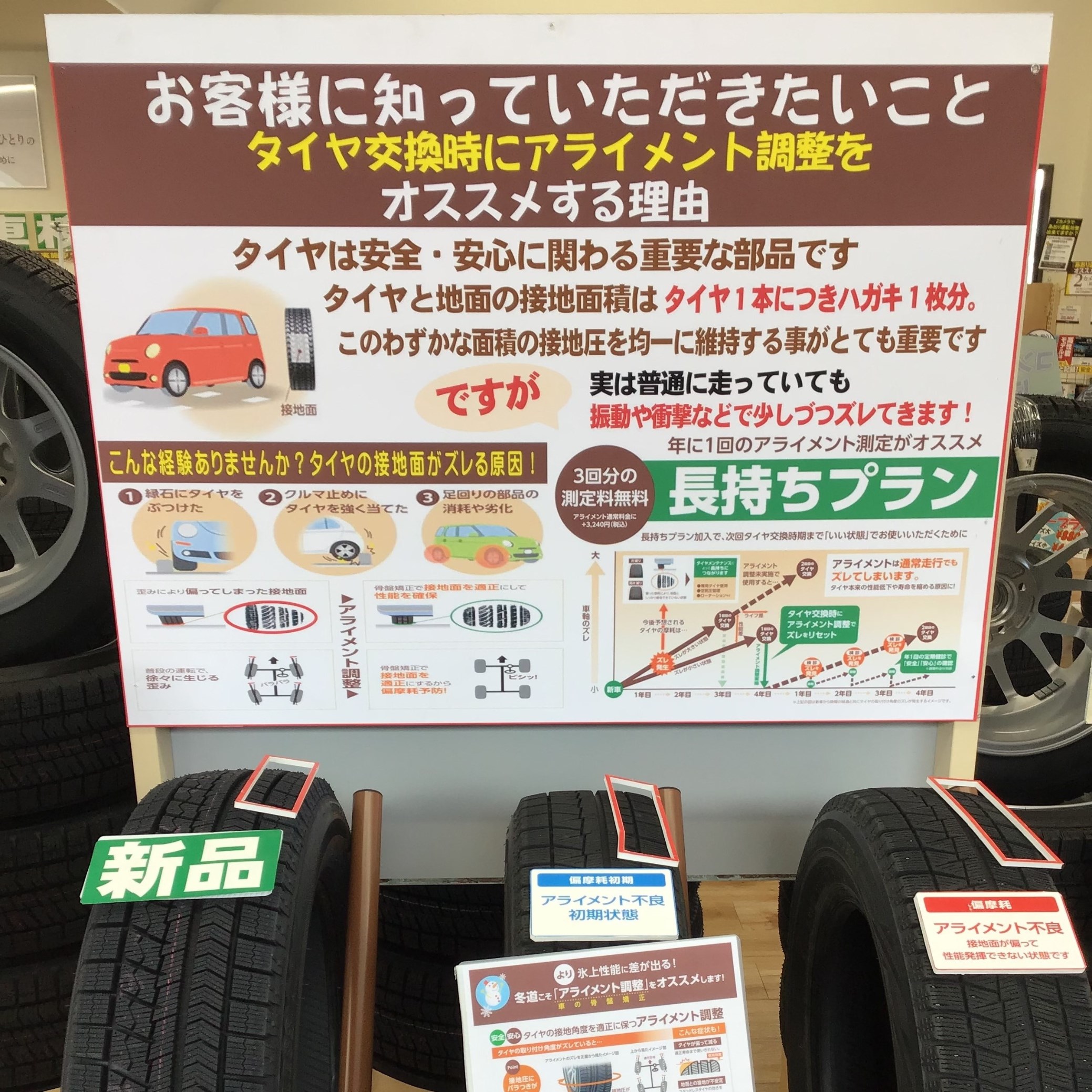 タイヤの取付角度がズレてくるとタイヤの減り方が均等ではなくなるので、寿命が短くなってしまう事も(><)