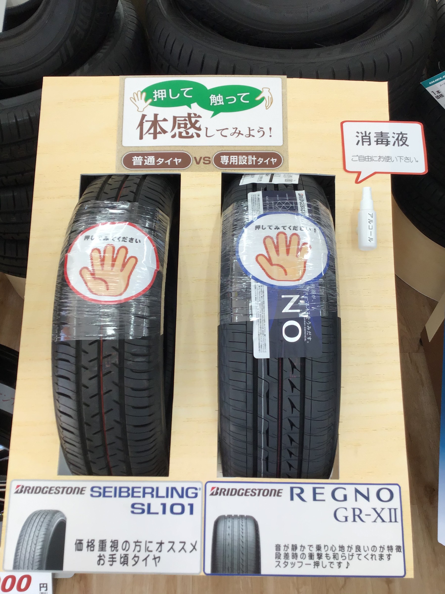 左にあるのがお買い得タイヤ、右にあるのがブリヂストンが誇るプレミアムタイヤ、レグノ。