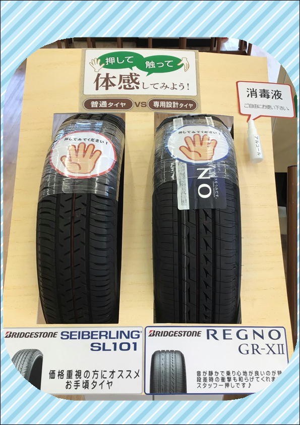 専用設計タイヤ(REGNO GR-XⅡ)の押し比べ展示をしています!!