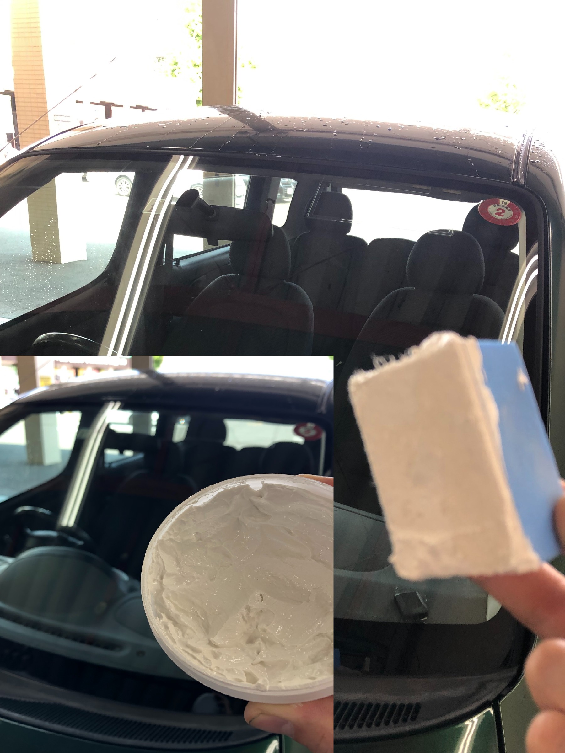 ②ガラスが濡れた状態からコチラのスポンジと溶剤で磨いていきます。