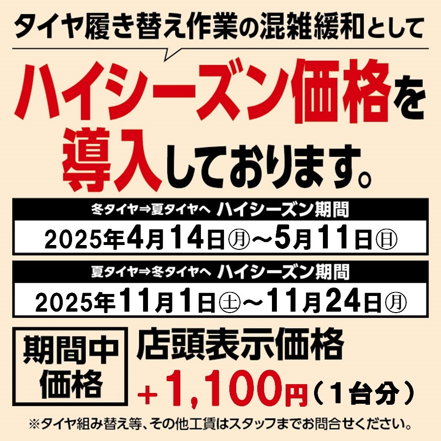 タイヤ交換・その他作業予約はWEBで24時間受付中 ポスト 2025年10月7日 【タイヤ交換ハイシーズン価格のお知らせ】 >>持ち込みタイヤ交換予約はこちらをクリック 関連情報もあわせてご覧ください ハイシーズン価格と新品タイヤ慣らし走行のお知らせ タイヤ館 北16条環状通り 住所:065-0016北海道札幌市東区北16条東18丁目3-25 電話番号: 011-785-3600 カテゴリ:タイヤ関連