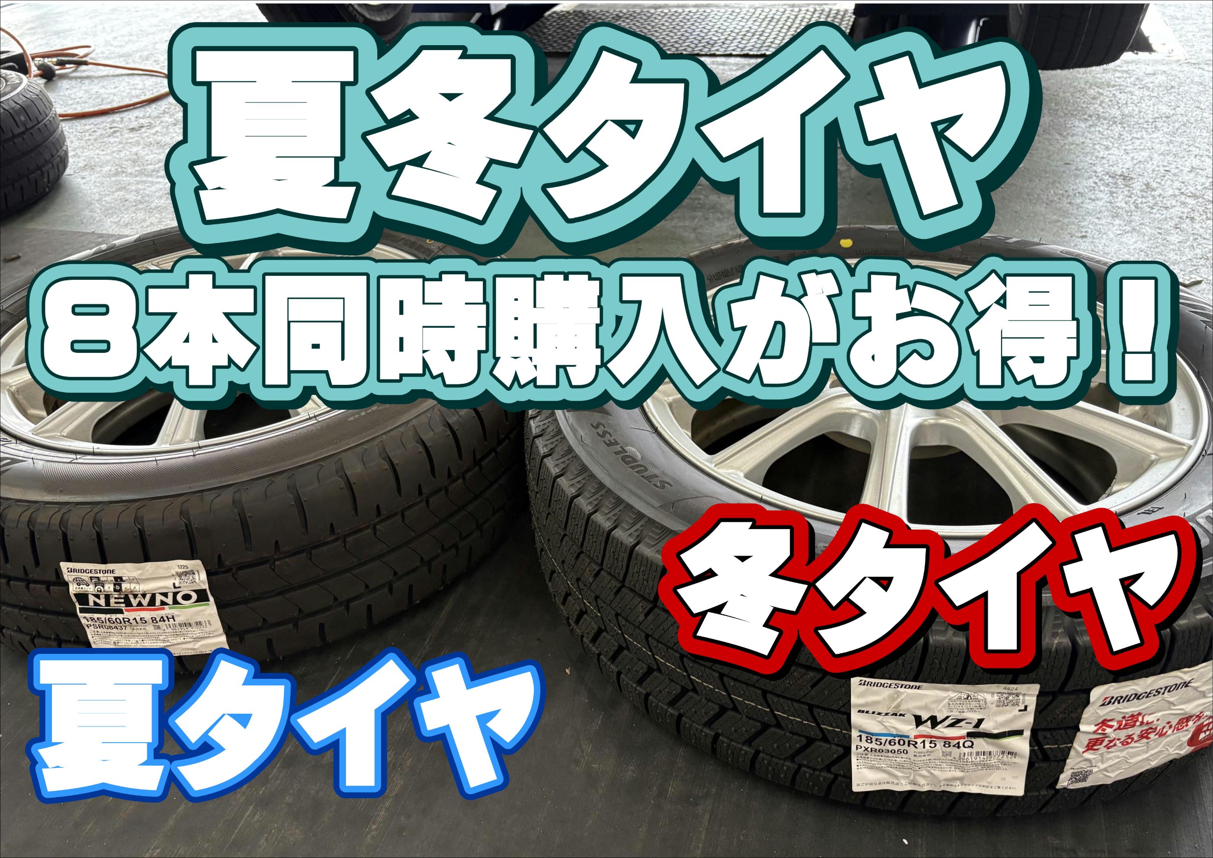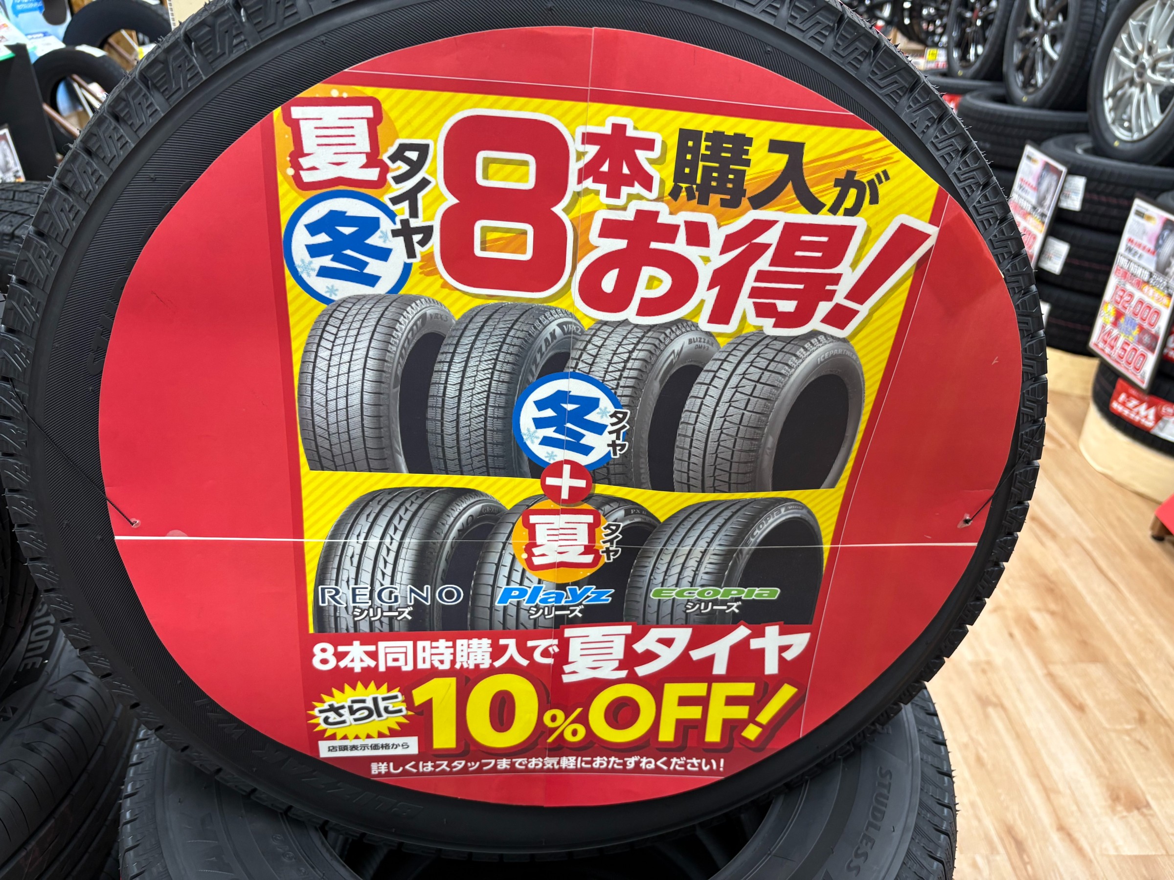 ただいまタイヤ館では夏タイヤ+冬タイヤの8本セット購入がお得になっています!