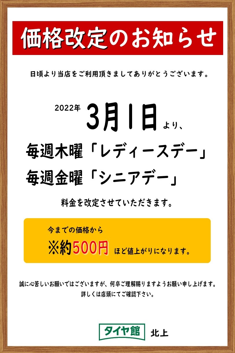 ※料金改定のお知らせ【レディースデー/シニアデー】 ポスト 2022年1月13日 こんにちは!タイヤ館北上です。 【ショップからのお知らせ】でもご案内しておりますが、 エンジンオイル交換がお得になる曜日デーに関しまして 料金改定させていただく事となりました。 【料金改定】 2022年 3月1日より ご迷惑をお掛け致しますが、ご理解の程宜しくお願い致します。