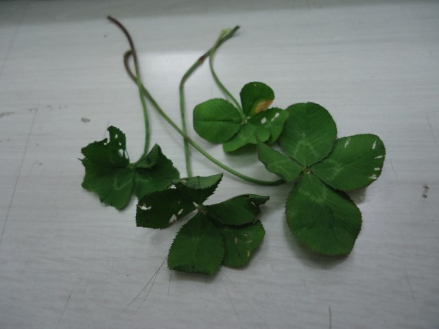 クローバー見っけ☆ ポスト 2019年9月9日 こんにちは!タイヤ館北上です。 今朝、店長及川が見つけて来てくれました。 四葉のクローバー。 テ、テーブルが傷だらけなのはご愛嬌(^^;) 中には五葉クローバーも! 五葉ってなんて呼ぶんですかね? いつつばクローバー?いつばクローバー?ごつばクローバー? 朝からほっこりしました☆