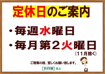 記事一覧 第二火曜・毎週水曜は【定休日】です! こんにちは! いつもタイヤ館北上WEBを ご覧いただきありがとうございます。 あす明後日の2日間は 当店定休日となります。 お間違えの無いよう ご確認下さいませ。 2026年1月12日 ポスト ブリヂストンタイヤ オンラインストアも好評です☆ こんにちは! いつもタイヤ館北上WEBを ご覧いただきありがとうございます。 まだまだ冬本番! スタッドレスタイヤを購入するなら オンラインストアからもご注文が可能ですよ~! オンラインストアでの商品購入はとても簡単で、 タイヤ購入から取付け予約、そして決済までもが 全てネットで完結でき... 2026年1月12日 ポスト