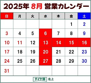 こんにちは! いつもタイヤ館北上WEBを ご覧いただきありがとうございます。 当店の8月営業カレンダーの ご案内です。 夏季休業ございますので お間違えの無いようご確認下さい。 8月の第2火曜日は通常営業いたします。