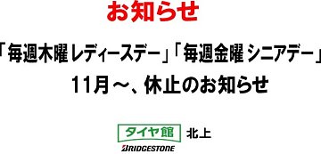 こんにちは! いつもタイヤ館北上WEBを ご覧いただきありがとうございます。 毎週木曜日/レディースデー 毎週金曜日/シニアデー を、 ご利用のお客様へお知らせです。 11月~、タイヤ交換シーズン中は 上記サービスを一時休止とさせて頂きます。 再開時期に関しては、混雑状況に応じて 判断させて...