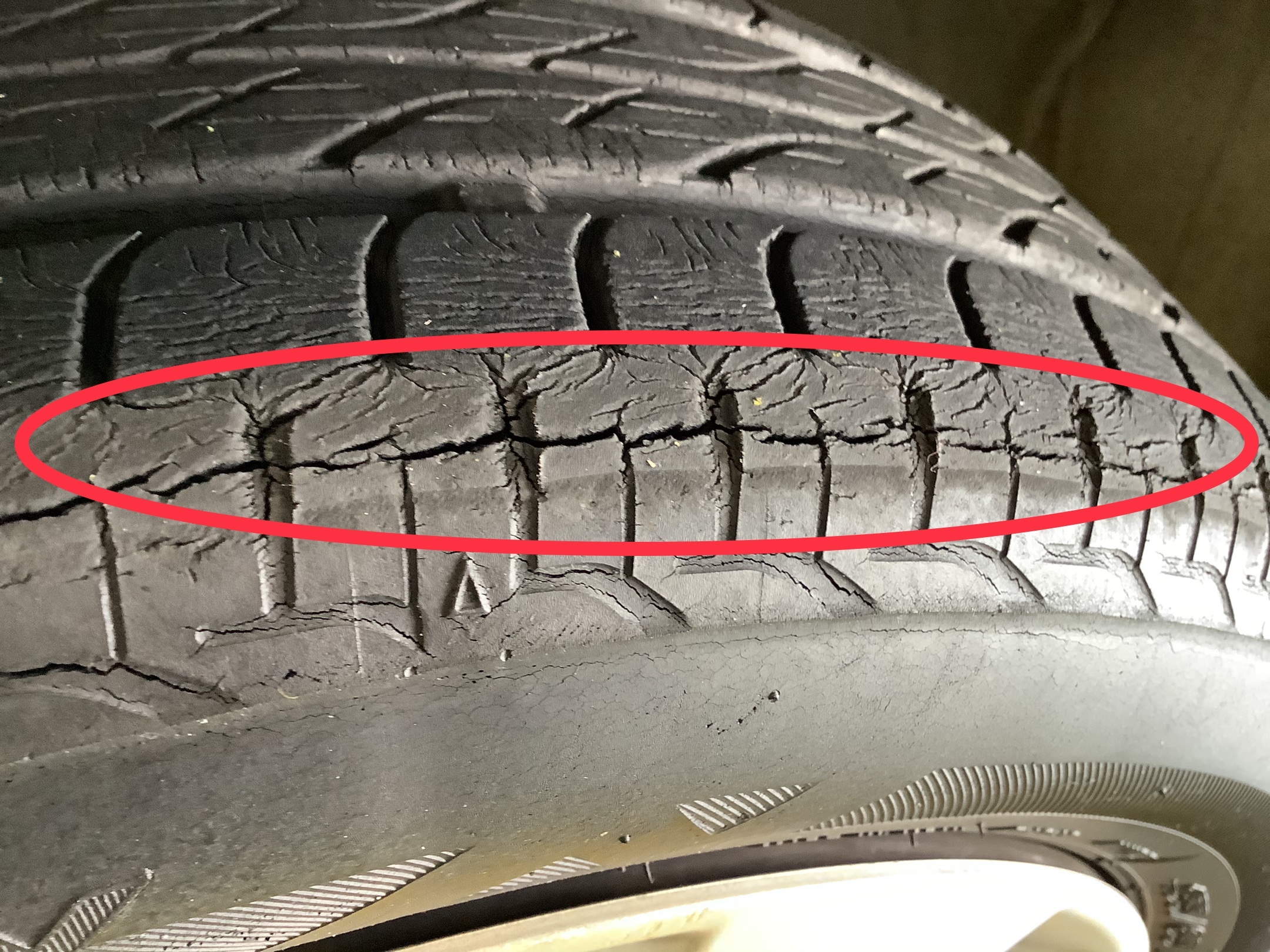 交換前のタイヤは経年劣化によるヒビ割れが深刻な状態でした(・・;)