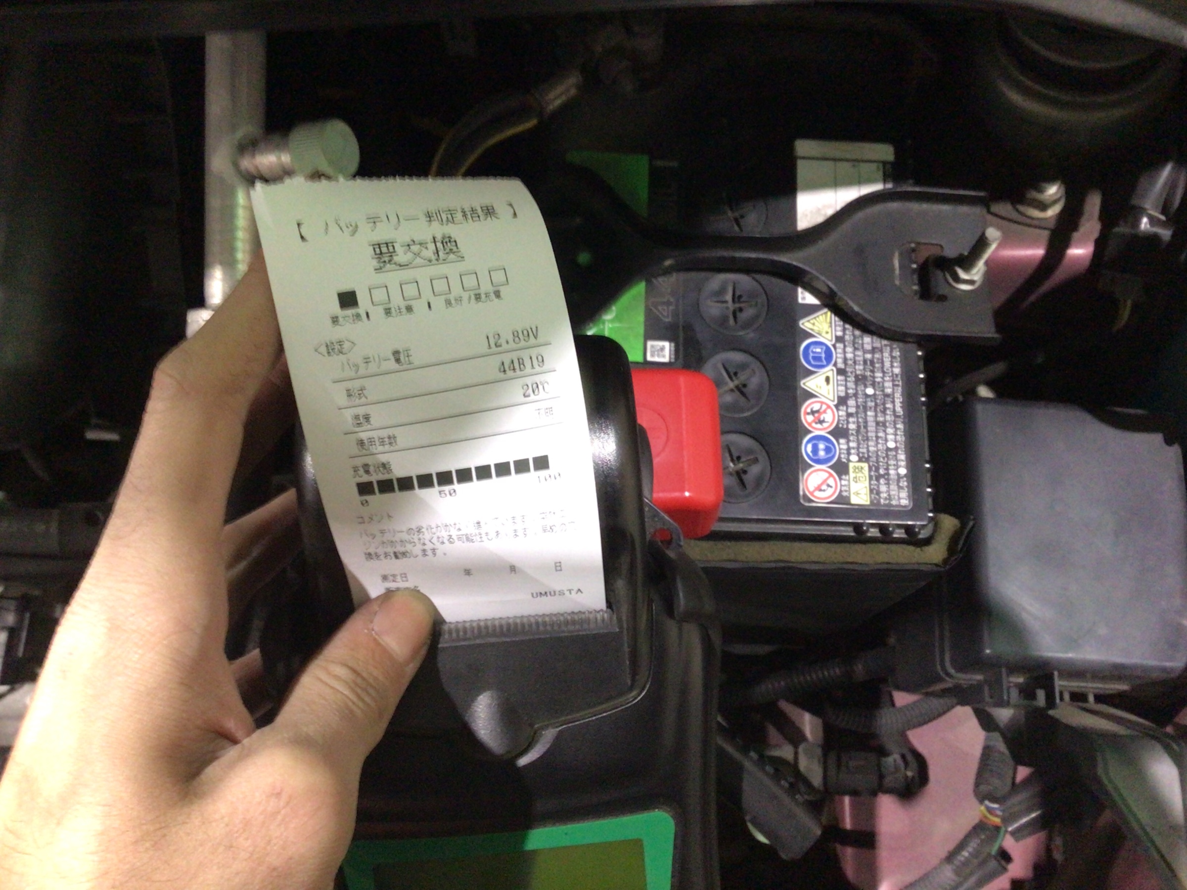 続いて専用のテスターでバッテリーの点検を行ったところ、要交換と出ましたので交換します。