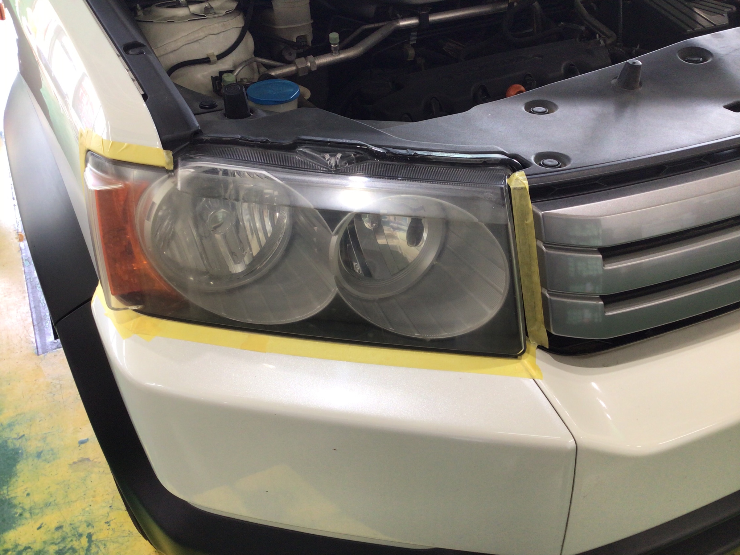 続いてヘッドライトコーティングです。保護テープを貼ってから研磨を行います。
