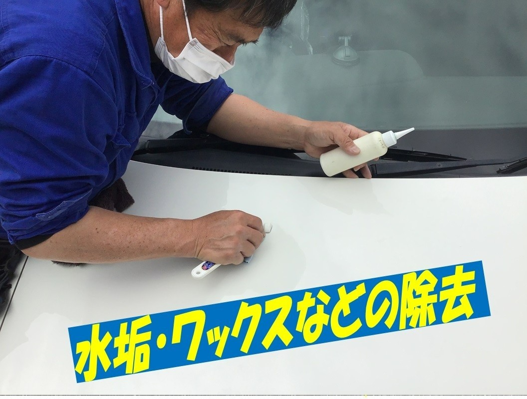 隅々まで洗車が終わったら、細かい部分の水垢や古いワックスなどの除去を行ってきます。