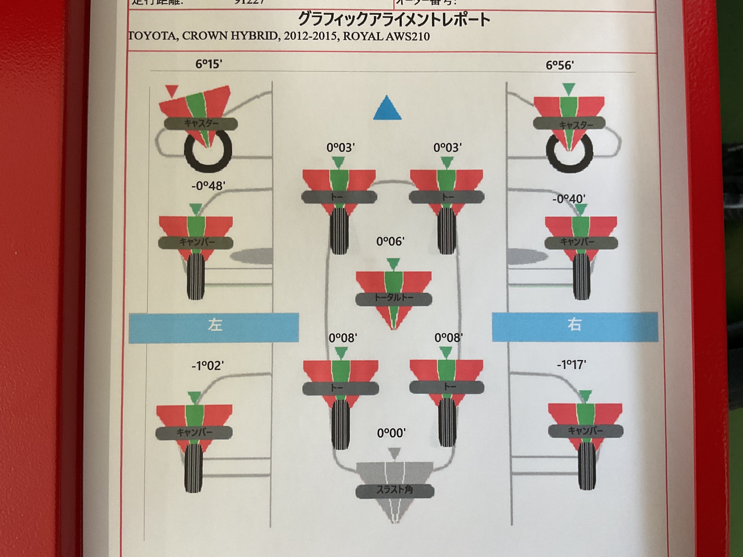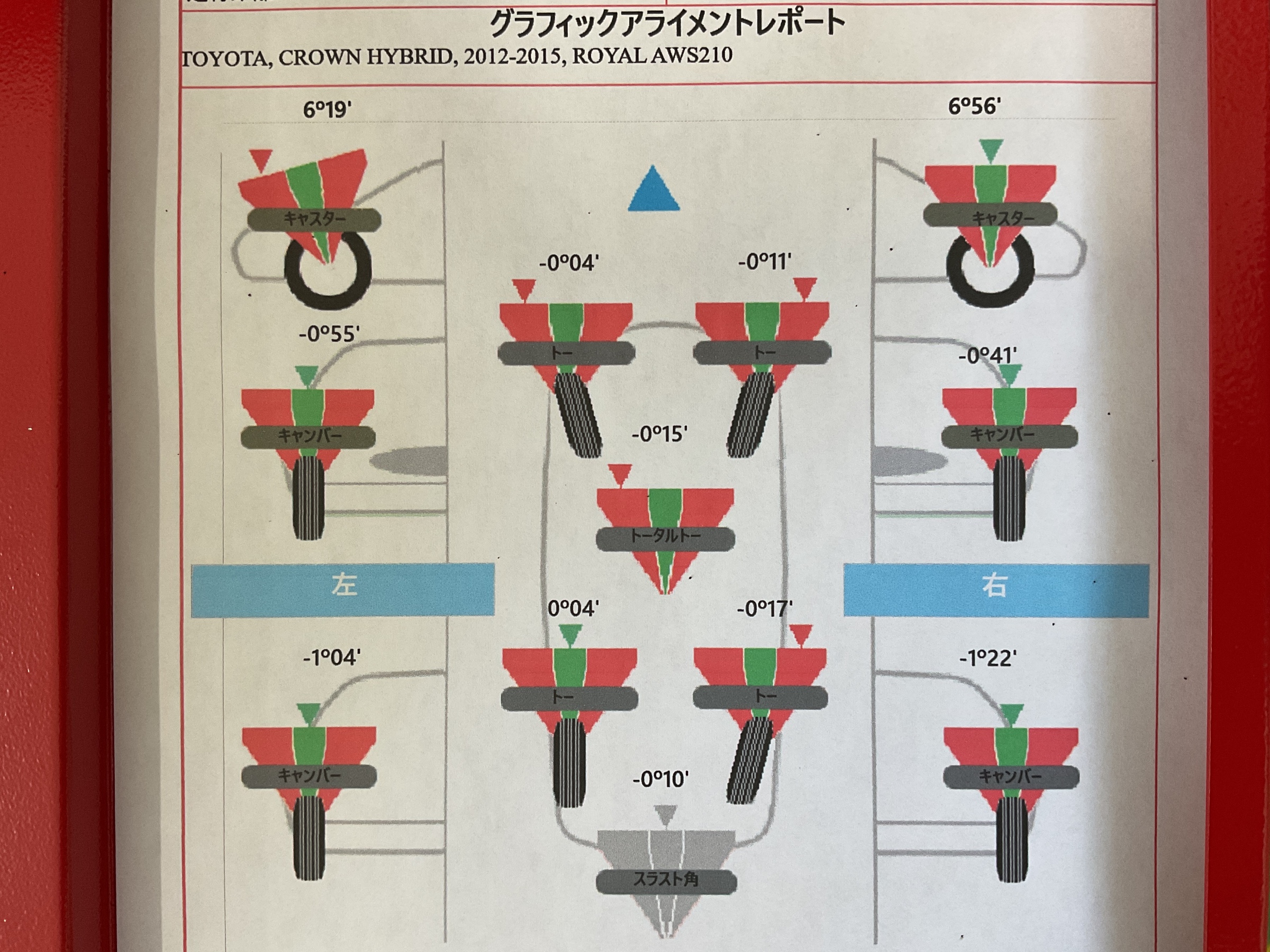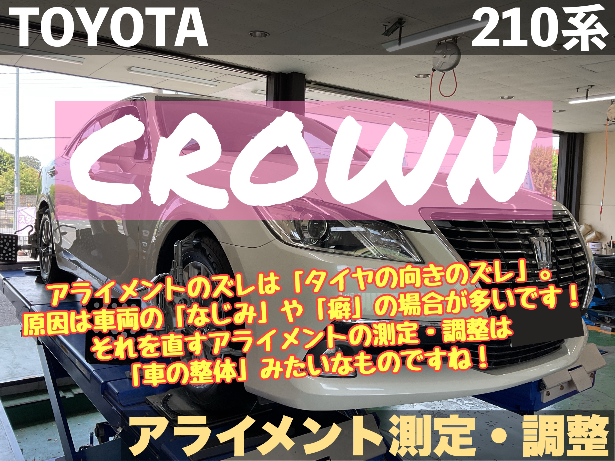 【トヨタ クラウン 210系】アライメントのズレは「タイヤの向きのズレ」。原因は車両の「なじみ」や「癖」の場合が多いです!それを直すアライメントの測定・調整は「車の整体」みたいなものですね!
