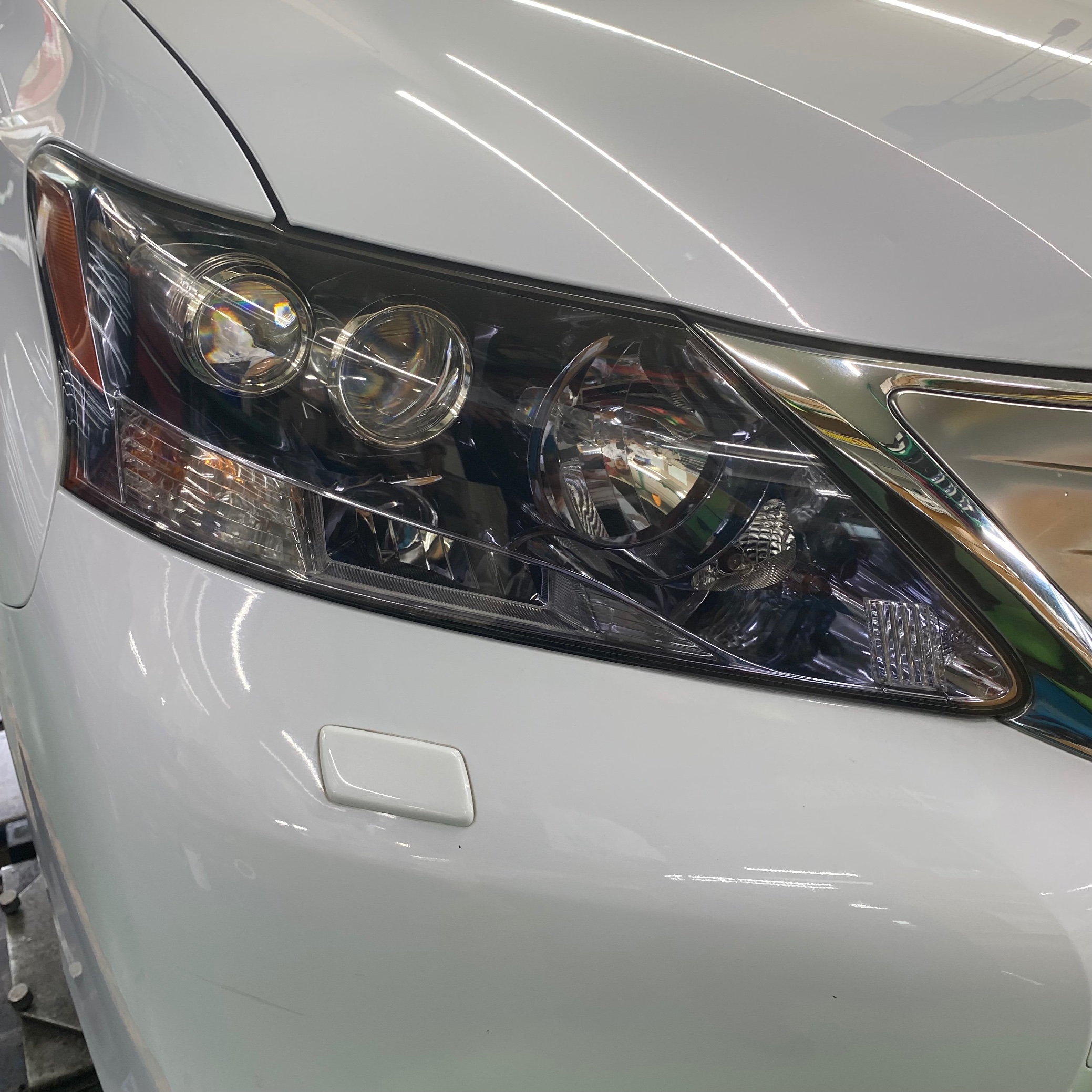 作業途中、ヘッドライトの「くすみ」が