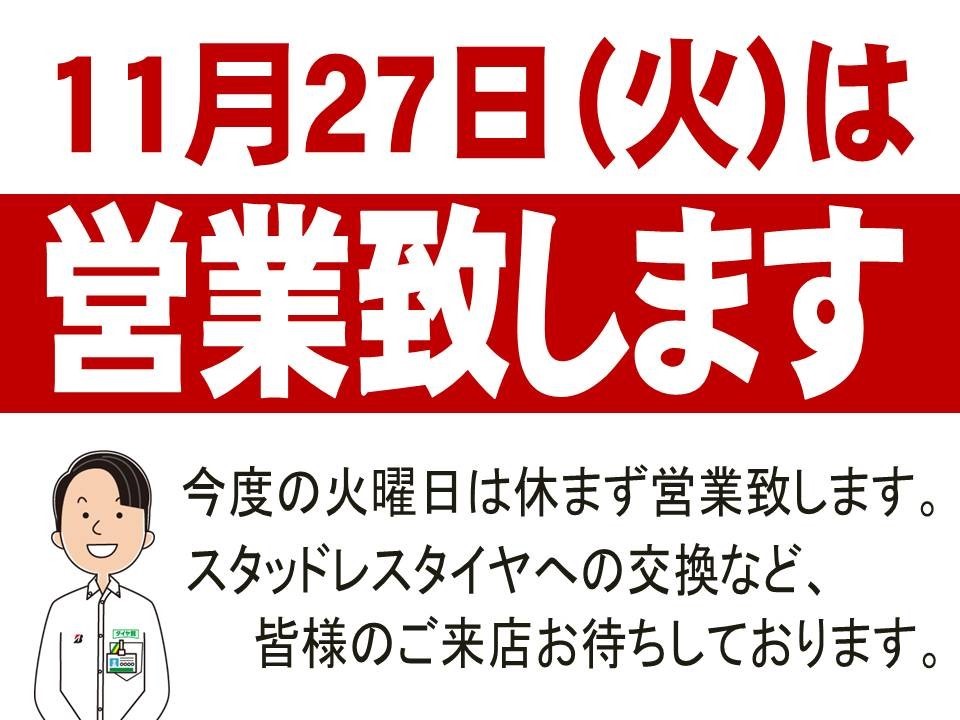 明日27日(火)は休まず営業いたします!! ポスト 2018年11月26日 皆さまこんにちは!! 明日27日火曜日は、休まず通常通り営業とさせていただきます^^ 営業時間は朝10時から夜7時までです!! スタッドレスタイヤへの交換・オイル交換等ぜひお越しくださいませ^^ 只今開催中の『大感謝祭&集中得市セール』も 12月2日(日)まで開催中です(^^♪ 担当:棚田