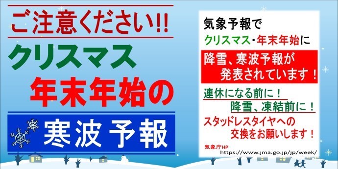 寒波予報が出ています!! ポスト 2018年12月22日 皆さまこんにちは!! 気象予報では、クリスマス・年末年始の寒波が発表されています!! (気象庁HPより) 連休前に!!降雪や凍結の前に!! ぜひスタッドレスタイヤへの交換をお願いいたします!! 年末は30日(日)まで営業中しております(^^♪ 在庫もできる限りご対応いたしますので、冬タイヤのご用命は ぜひタイヤ館北山店まで!! 担当:棚田