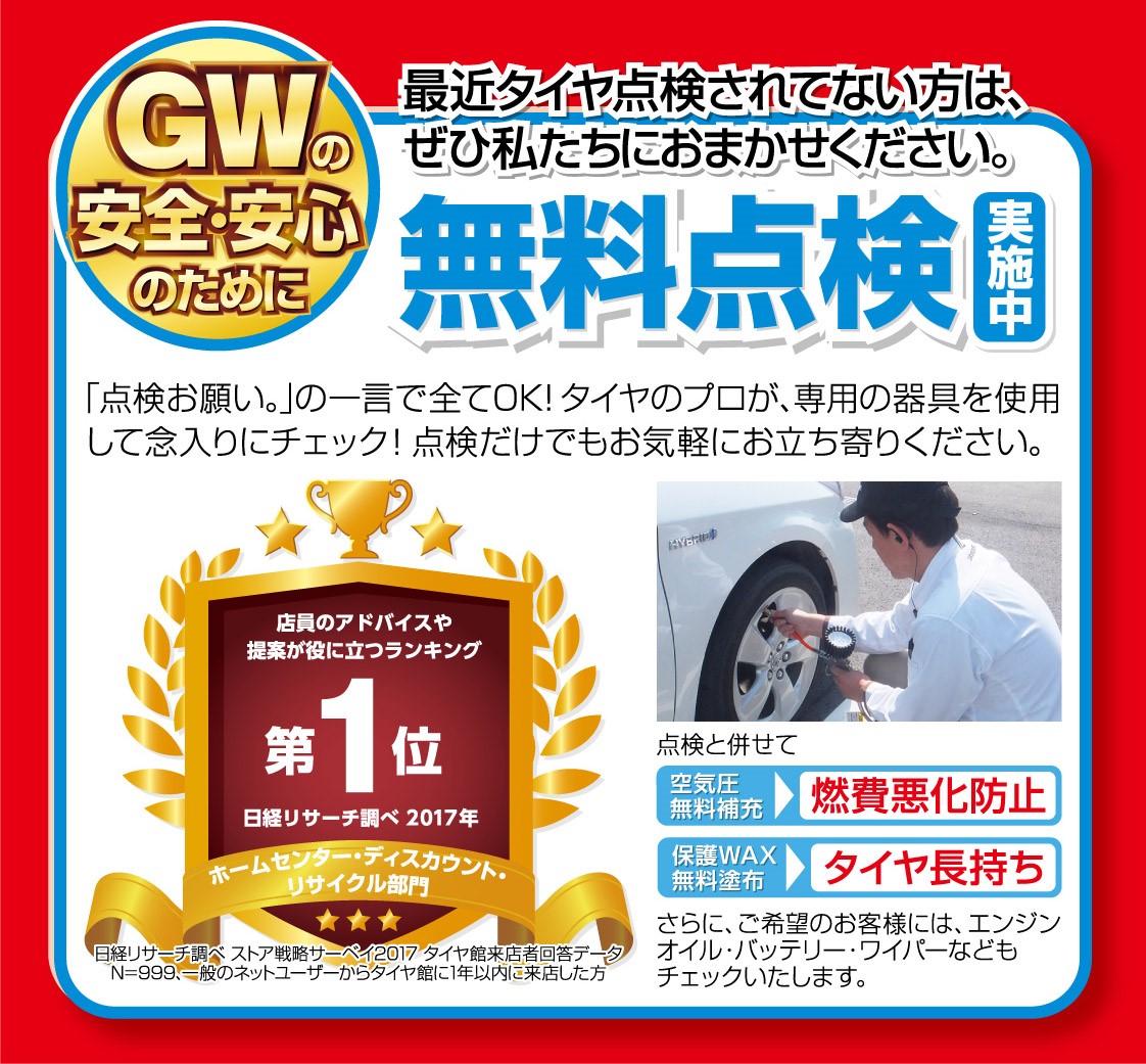 タイヤ館北山では、タイヤの無料点検も行っております(^^)/
