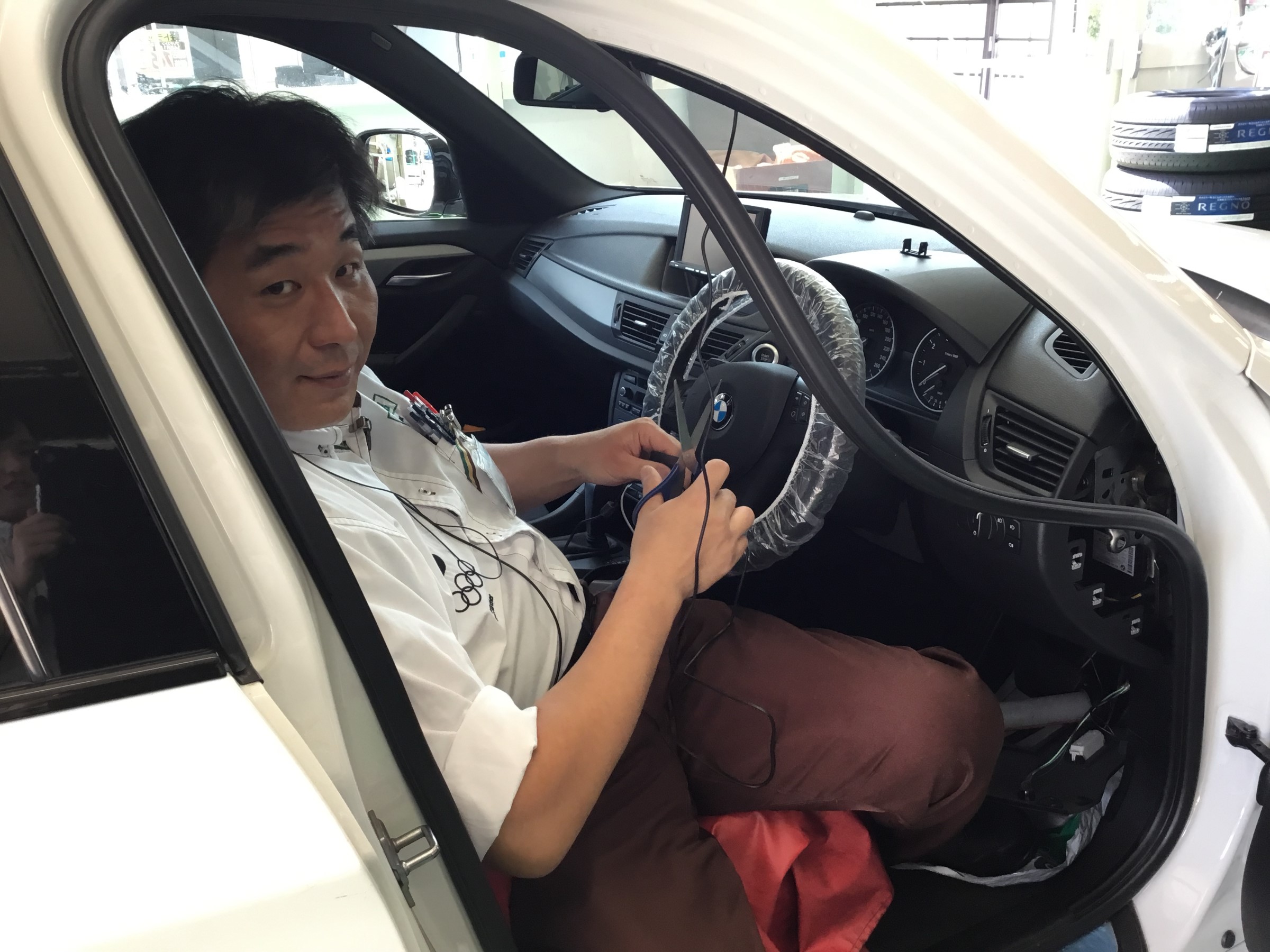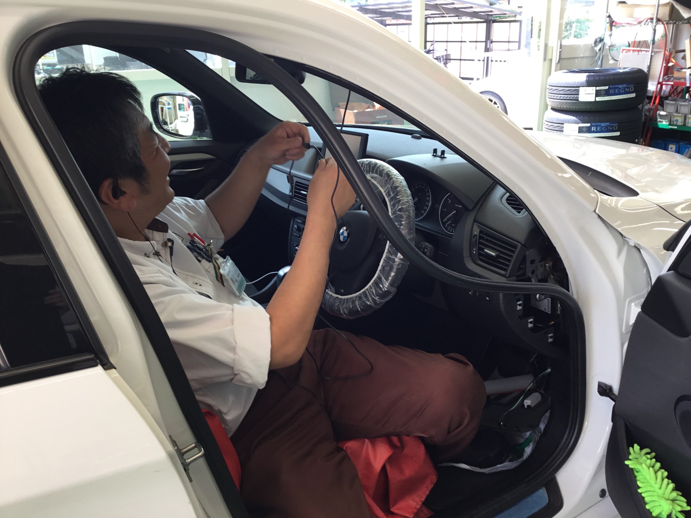 ドライブレコーダーの取り付けを行っている、