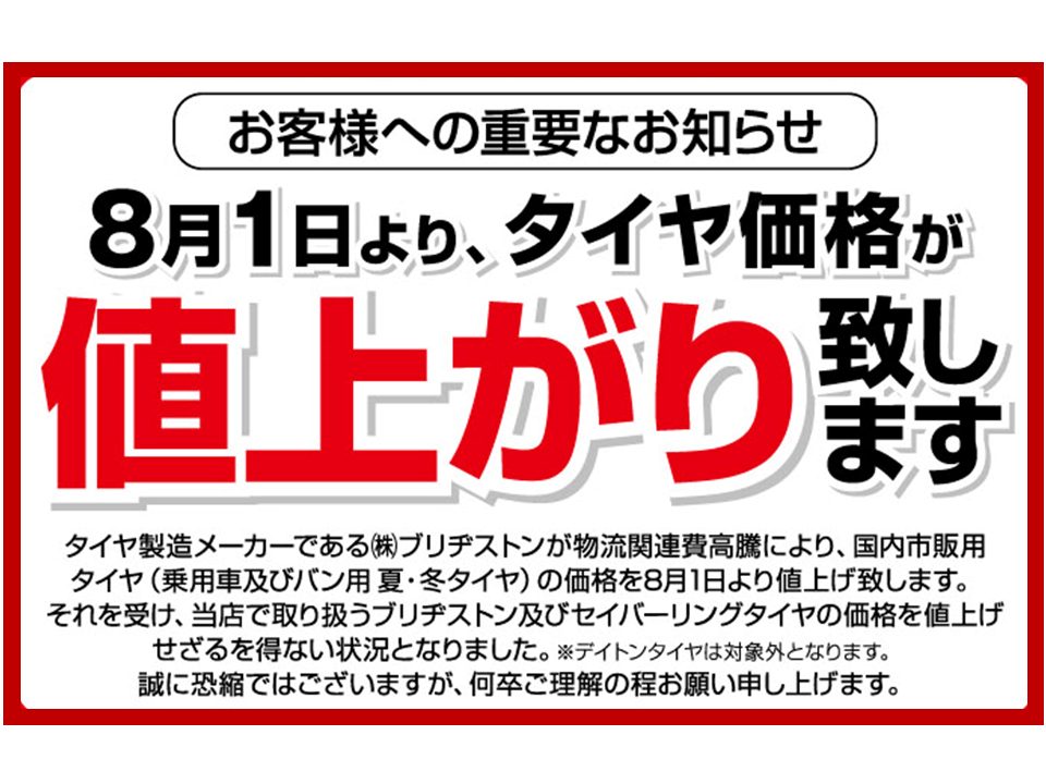 【大切なお知らせ。】8月1日よりタイヤ価格が値上がり致します。