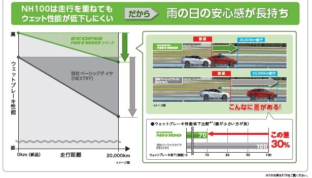 このタイヤは走行を重ねても、ウェット性能が低下しにくいのです。