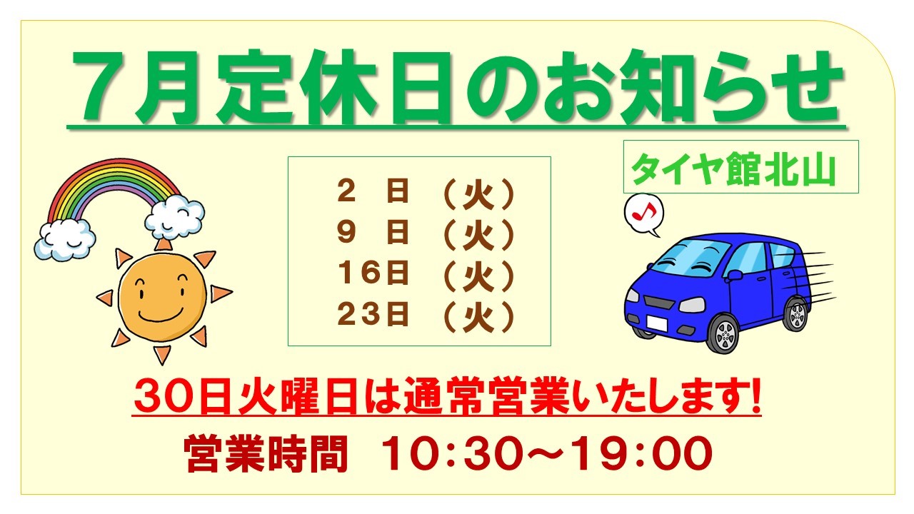 今日はタイヤ館北山の7月の定休日についてお知らせいたします。