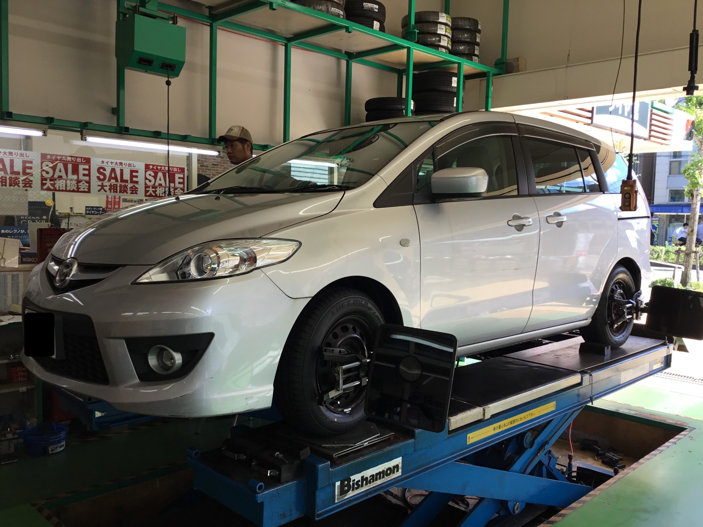プレマシー タイヤ交換、アライメント、TPMSお取り付け。