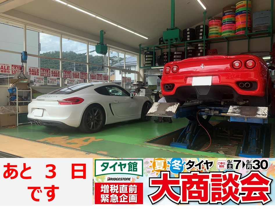 緊急セールもあと3日 ポスト 2019年9月28日 こんにちは(^^)/ 今日は朝からさわやかな秋晴れで気持ちいですね(^^♪ セール最終の土日ということもあり 朝からたくさんのご来店、ありがとうございました。 来月からは消費税が上がるということで、 夏タイヤ・冬タイヤ・ドライブレコーダーなど 本日もたくさんのご注文を賜りました。 ありがとうございます。 セールも残すところあと3日ですが スタッフ一同皆様のご来店をお待ちしております(^_-)-☆ 担当:てんちょ