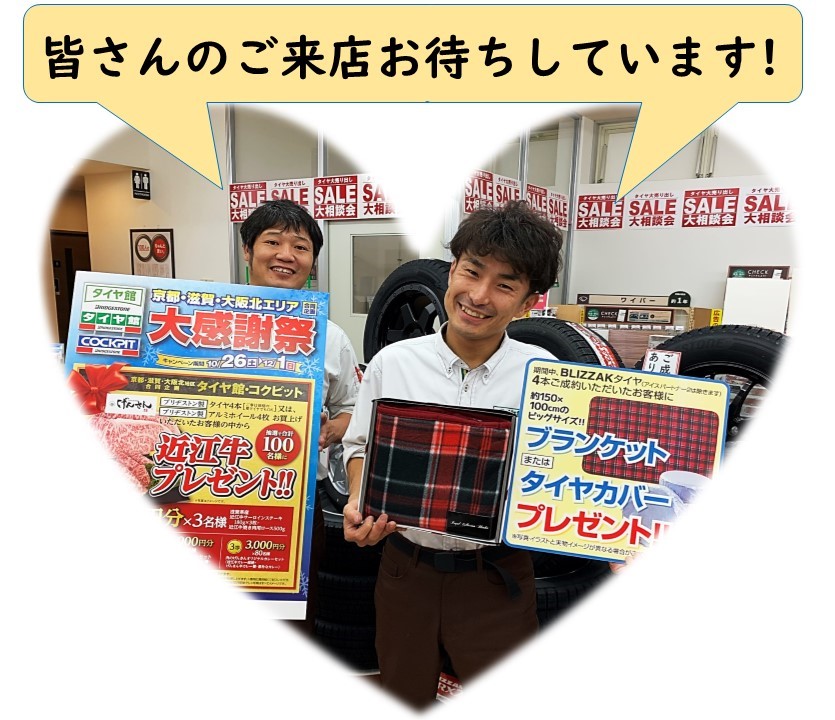 プレゼント盛りだくさん! ポスト 2019年10月27日 10/26からはじまりました大感謝祭! 初日からたくさんのご来店ありがとうございます。 今回のセールでは、タイヤ4本もしくは ホイール4枚お買い上げで、 なんと近江牛が抽選で当たります!! またブリザックブランドの スタッドレスタイヤお買い上げで、 ブランケットもしくは保管カバーをプレゼント!! ぜひこの機会にタイヤ館北山へお越しください(^^)/ スタッフ一同お待ちしております(^_-)-☆ 担当:てんちょ