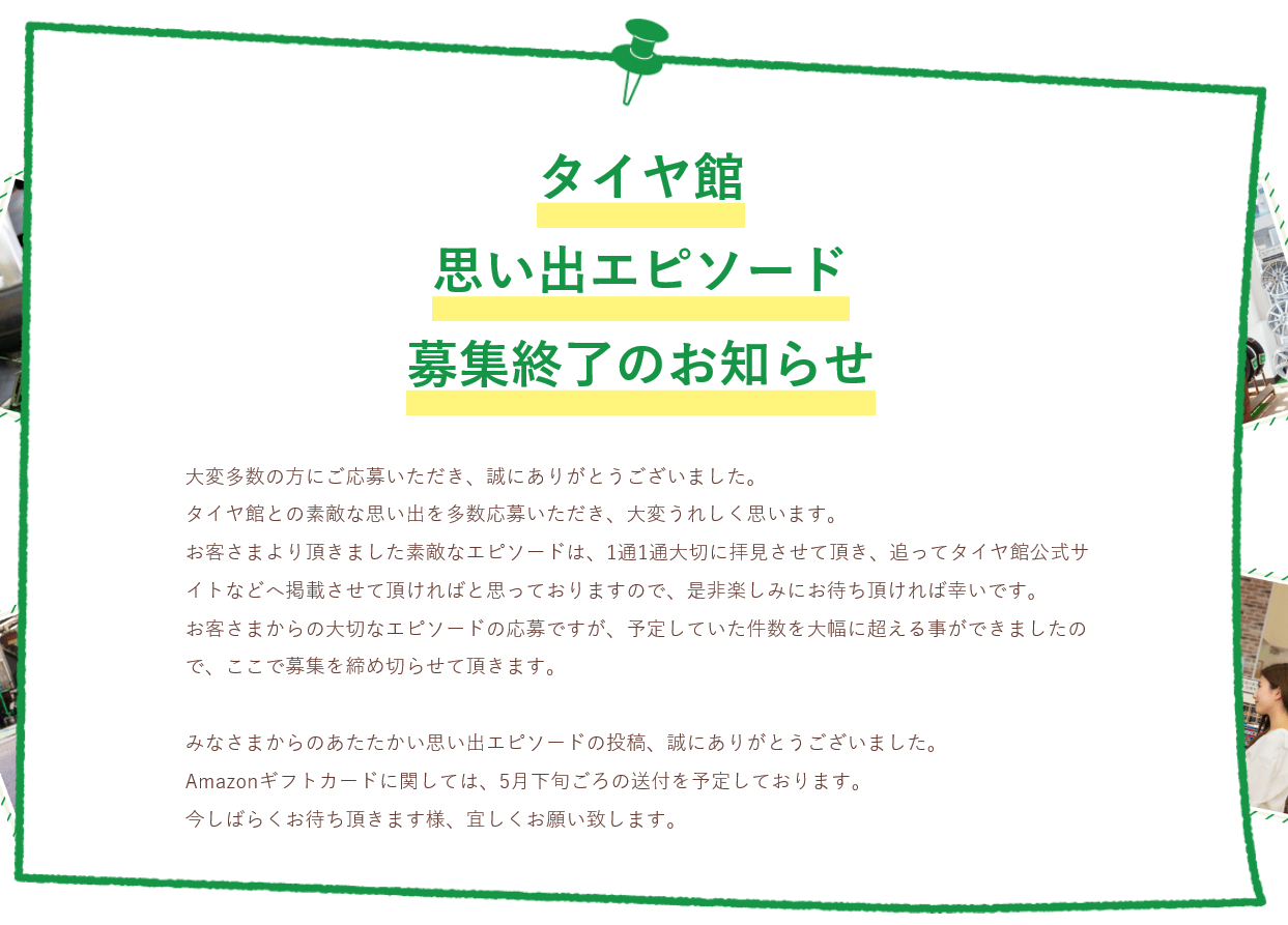 「タイヤ館思い出エピソード」募集終了のお知らせ