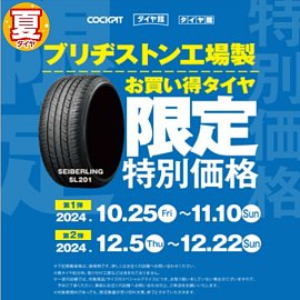こんにちは、いつも当店をご利用いただきましてありがとうございます。 現在、コクピット・タイヤ館の一部店舗におきまして、 期間限定! サイズ限定!! 数量限定!!! で、ブリヂストン工場製のお買い得タイヤ「SEIBERLING」をスペシャルプライスでご提供中です。 もちろん、当店でもご提供して...