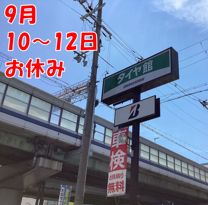 いつもタイヤ館神戸のホームページをご覧いただきありがとうございます。 誠に勝手ながら、 9月は毎週火曜日の他に 11日(水)と12日(木)もお休みを頂いております。 いつもご利用頂く皆様にはご迷惑をお掛け致しますが、 宜しくお願い致します。 休日でもタイヤの購入が可能です 詳しくはこちらから