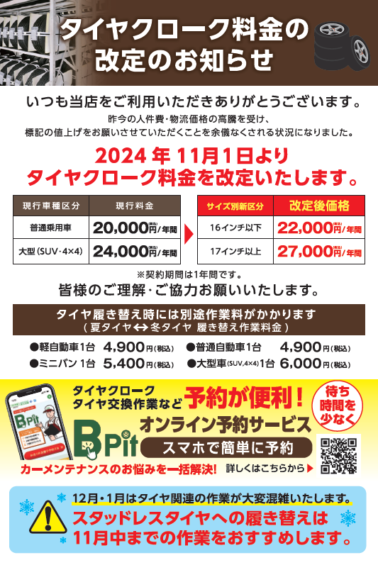 いつもタイヤ館神戸店のホームページを ご覧いただきありがとうございます。 突然ですが、以下の通り、 2024年11月1日よりタイヤクローク料金を改定 させて頂きます。 何卒、ご理解・ご協力の程 宜しくお願い致します。 ~~~~~~~~~~~~~~~~~~~~~~~~~~~~~~ - 営業時間 -...