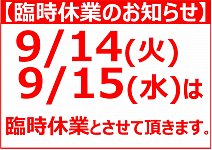 いつもタイヤ館神戸のホームぺージを ご覧いただき誠にありがとうございます。 9/14(火)と9/15(水)の2日間、 誠に勝手ながら 臨時休業とさせて頂きます。 ご不便をお掛け致しますが ご理解の程 よろしくお願い致します。