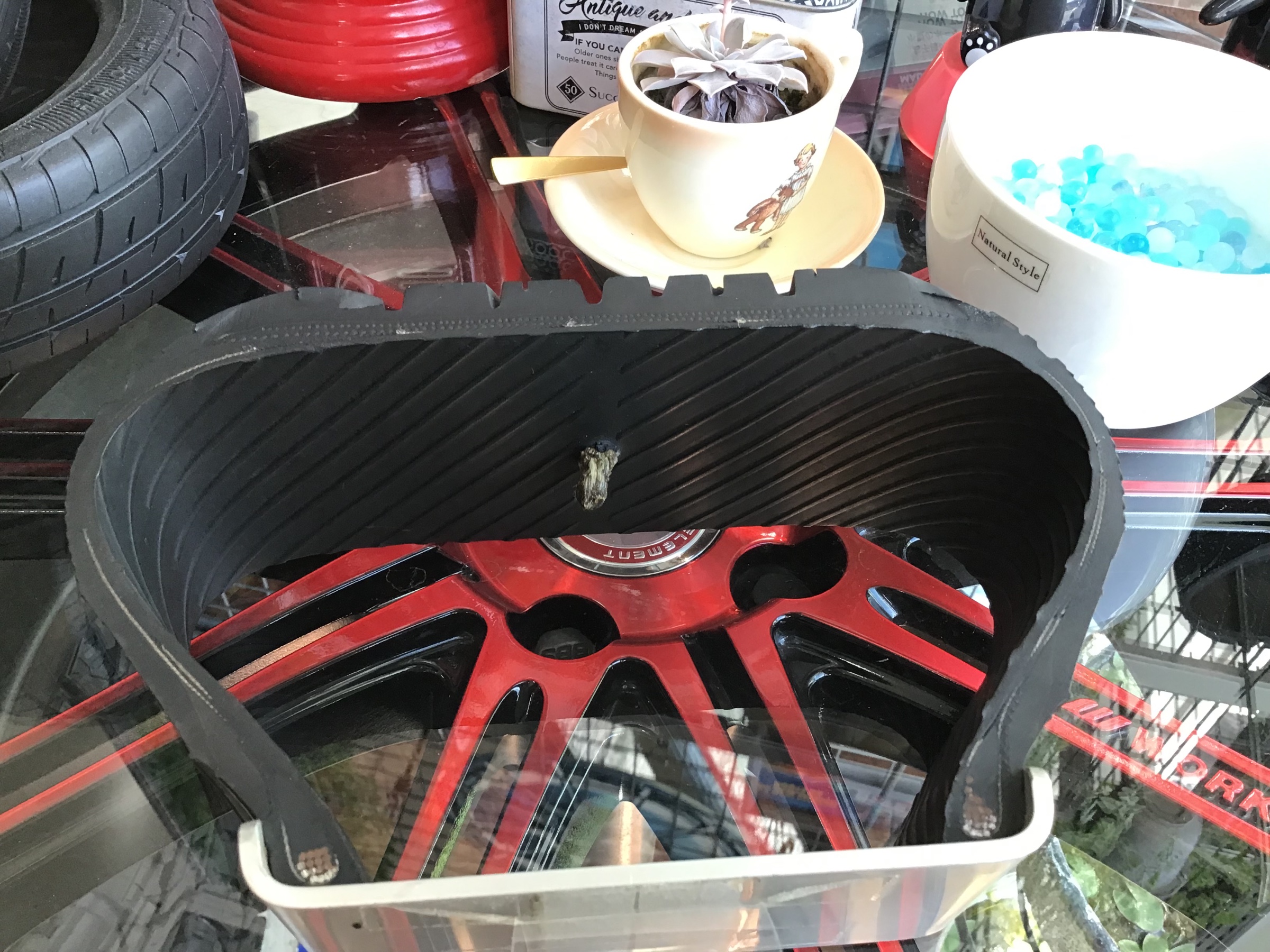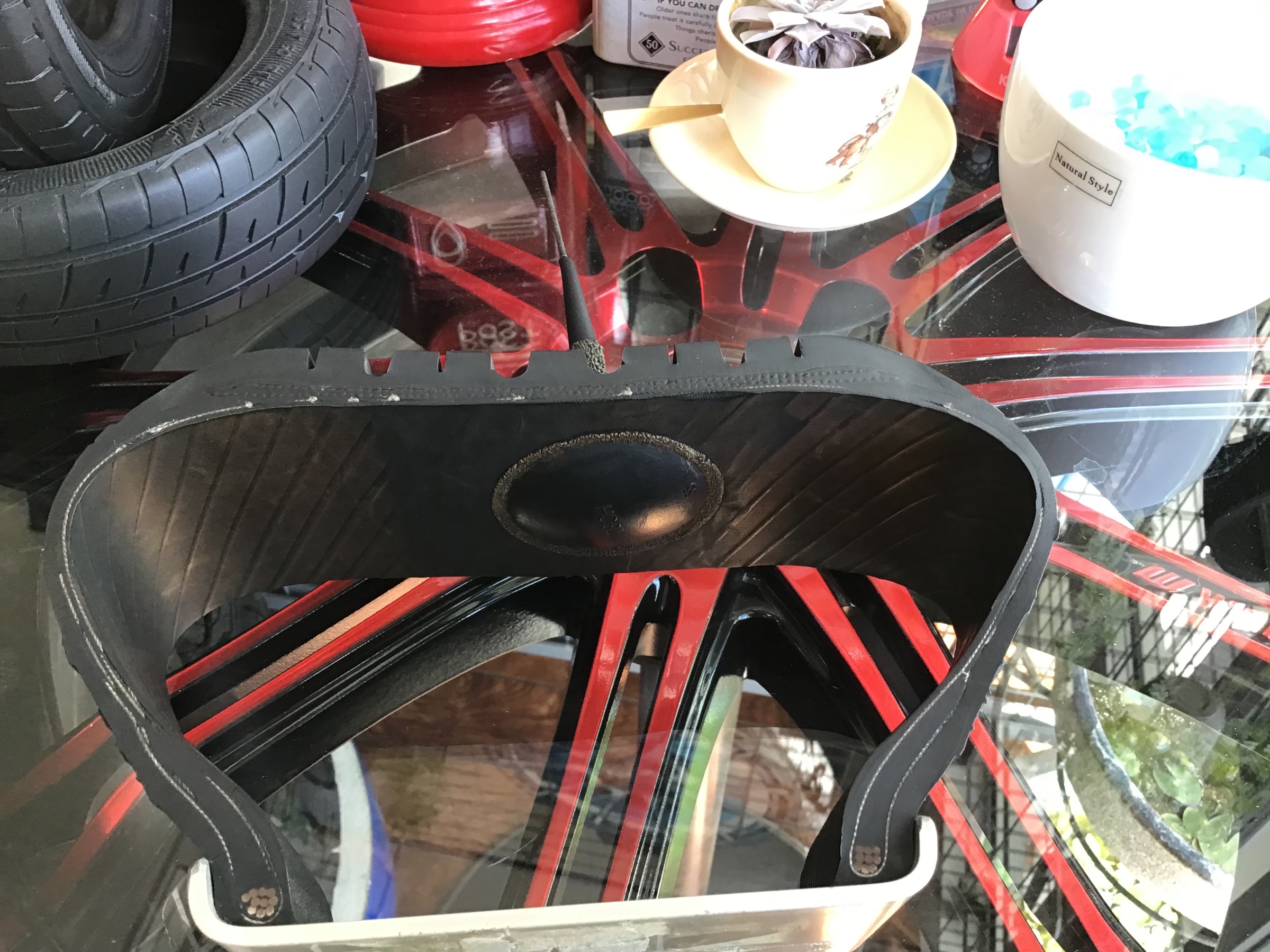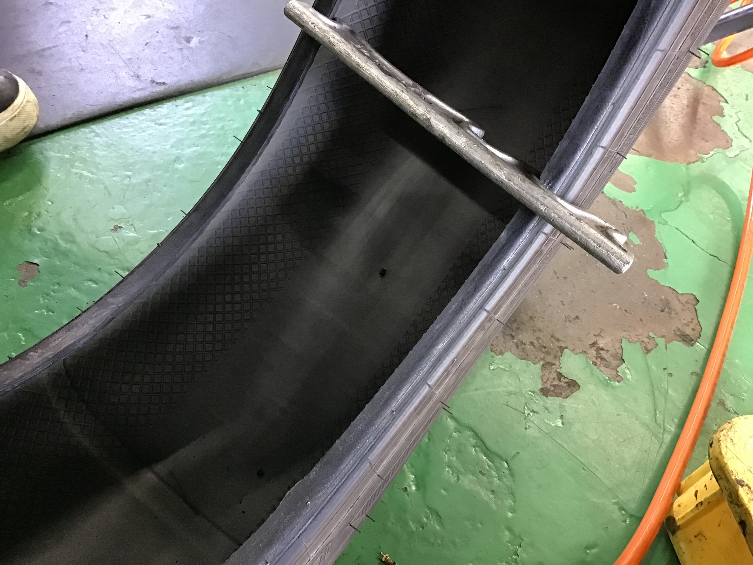 少しだけ表面(インナーライナー)を削って下処理施します! 簡単に見えて非常に高い技術が必要なんです。これやり過ぎるとタイヤ使えなくなっちゃいます。