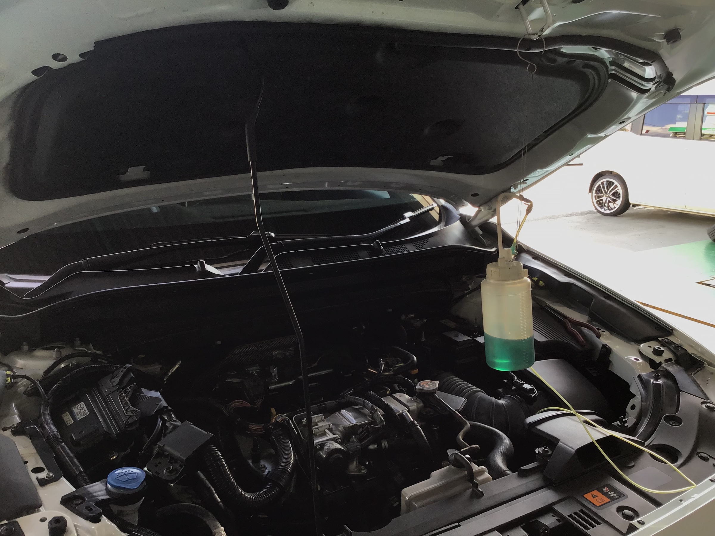 まるで点滴みたいですが、この様に溶剤を直接エンジン内部に注入。