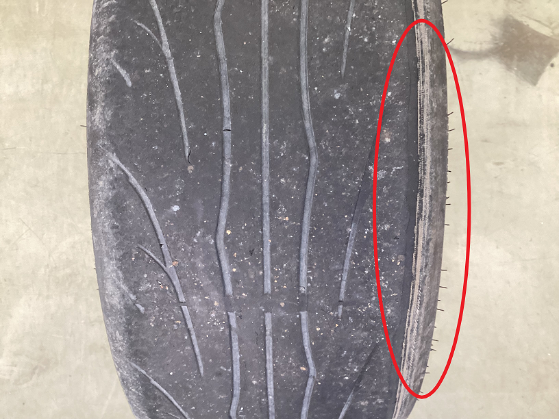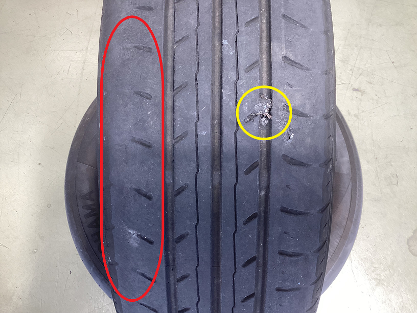 【事例④】偏摩耗に加えて、パンク外面修理痕(〇印)もありましたね・・・(◞‸◟)