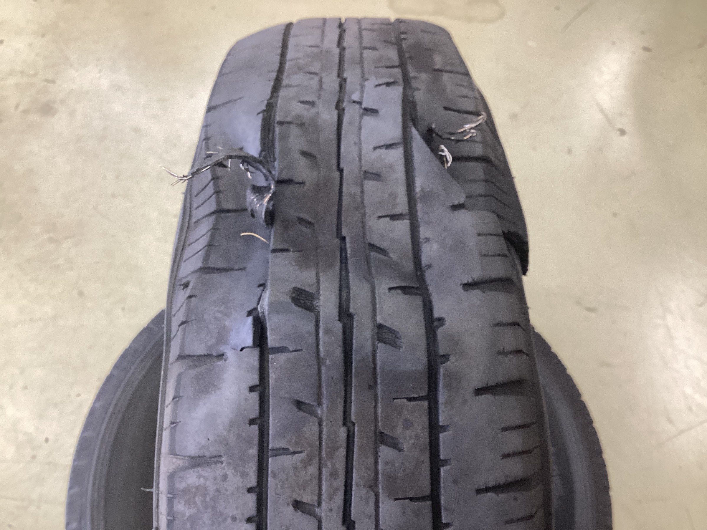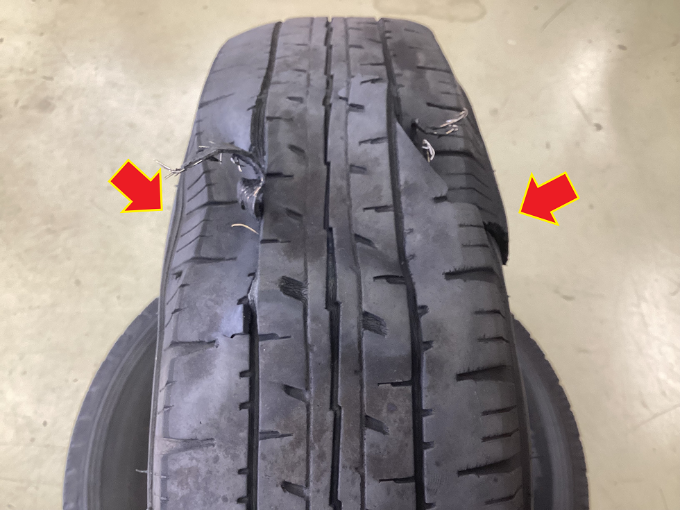今回はレッカー車での来店でしたが、タイヤはかなりヒドイ状態です。