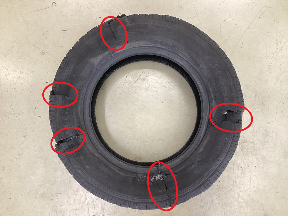 タイヤ側面に、5箇所の亀裂が発生しています・・・