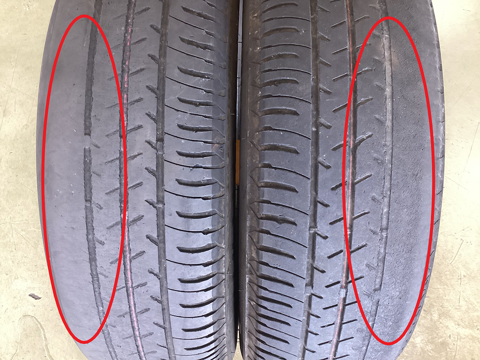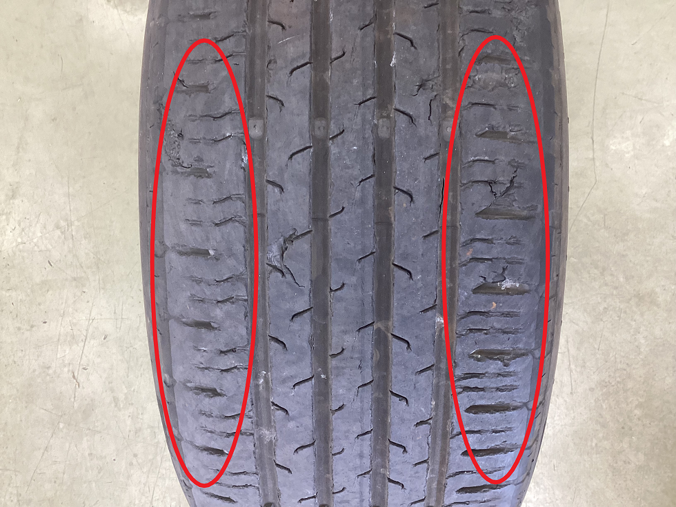 ⑤偏摩耗 原因:アライメント不良・空気圧不足により発生する現象