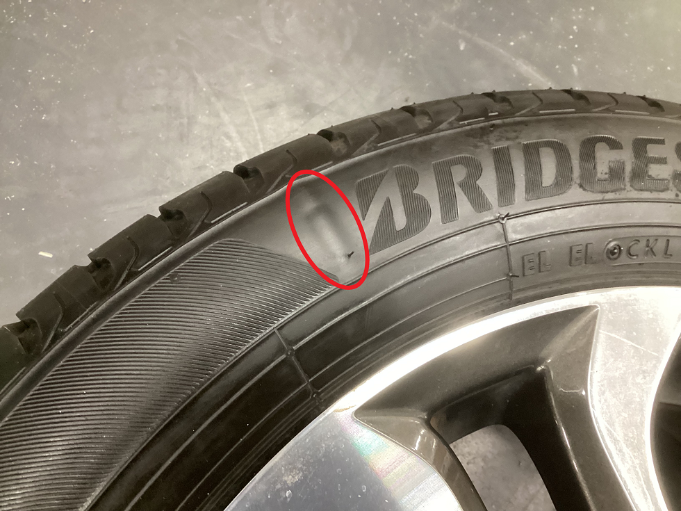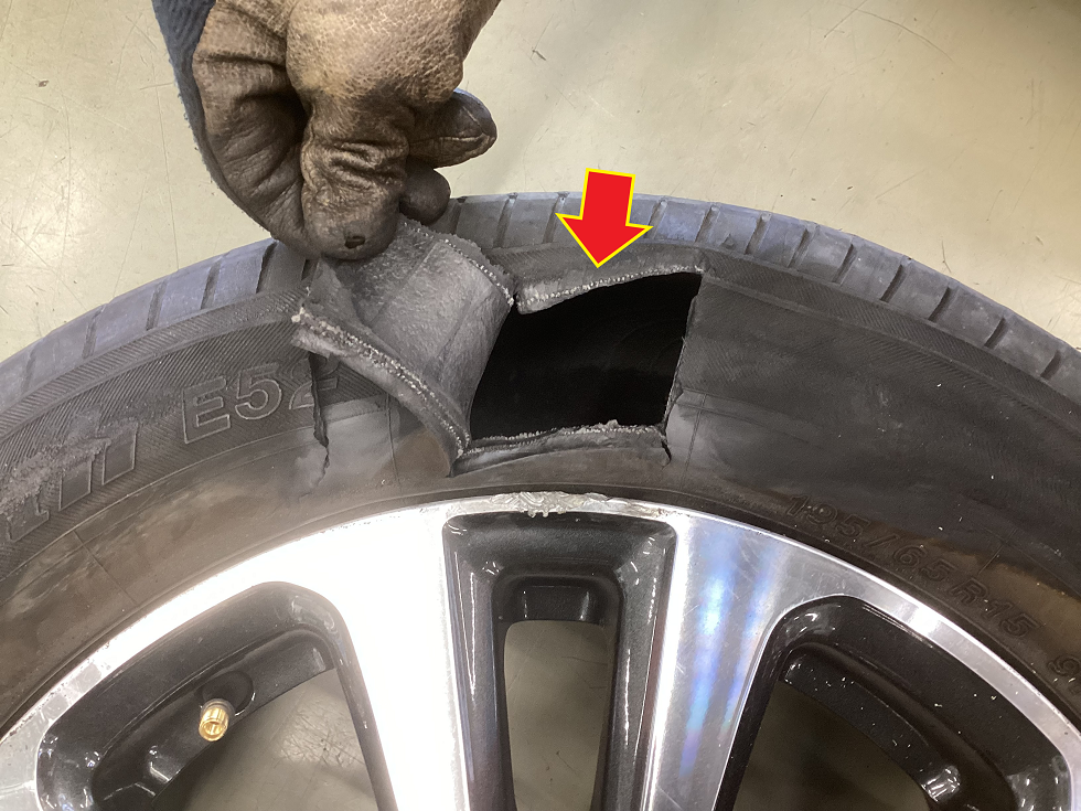 ②サイドカット 原因:タイヤ側面を強打して、タイヤが破れてしまう現象