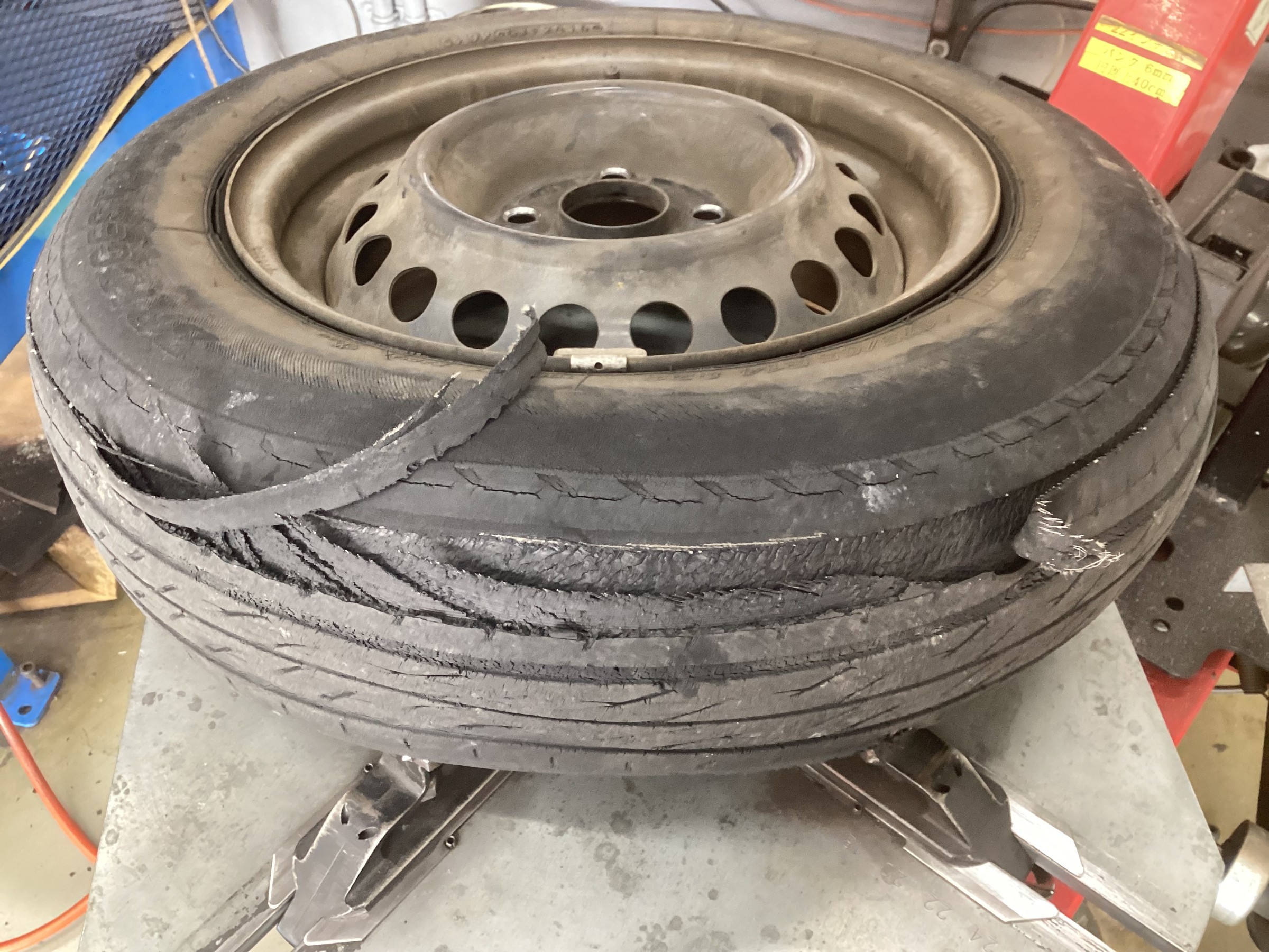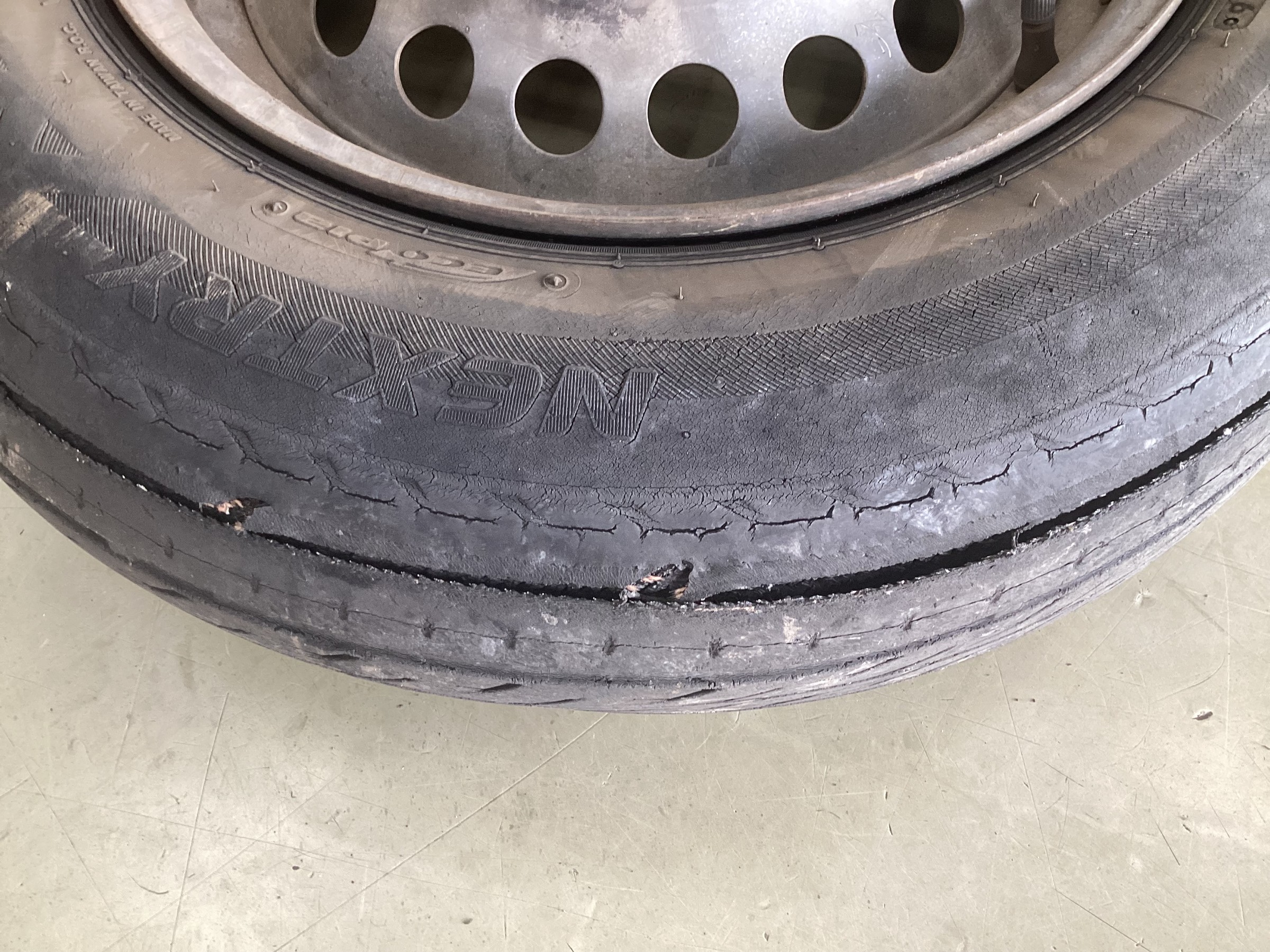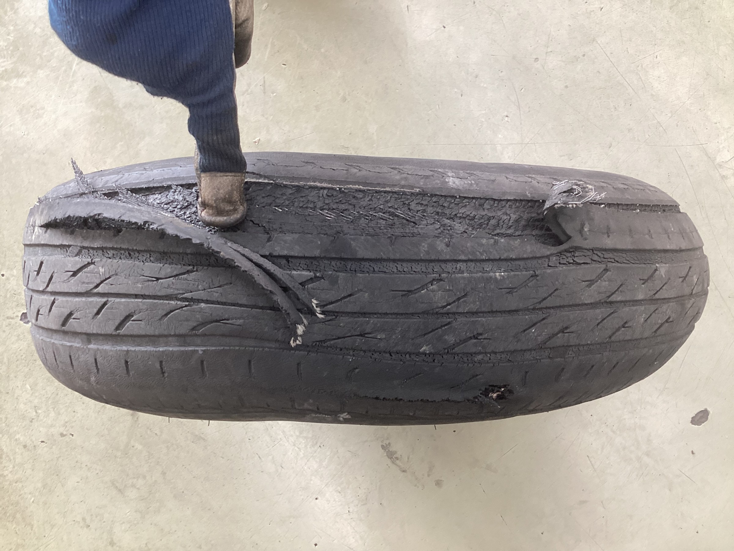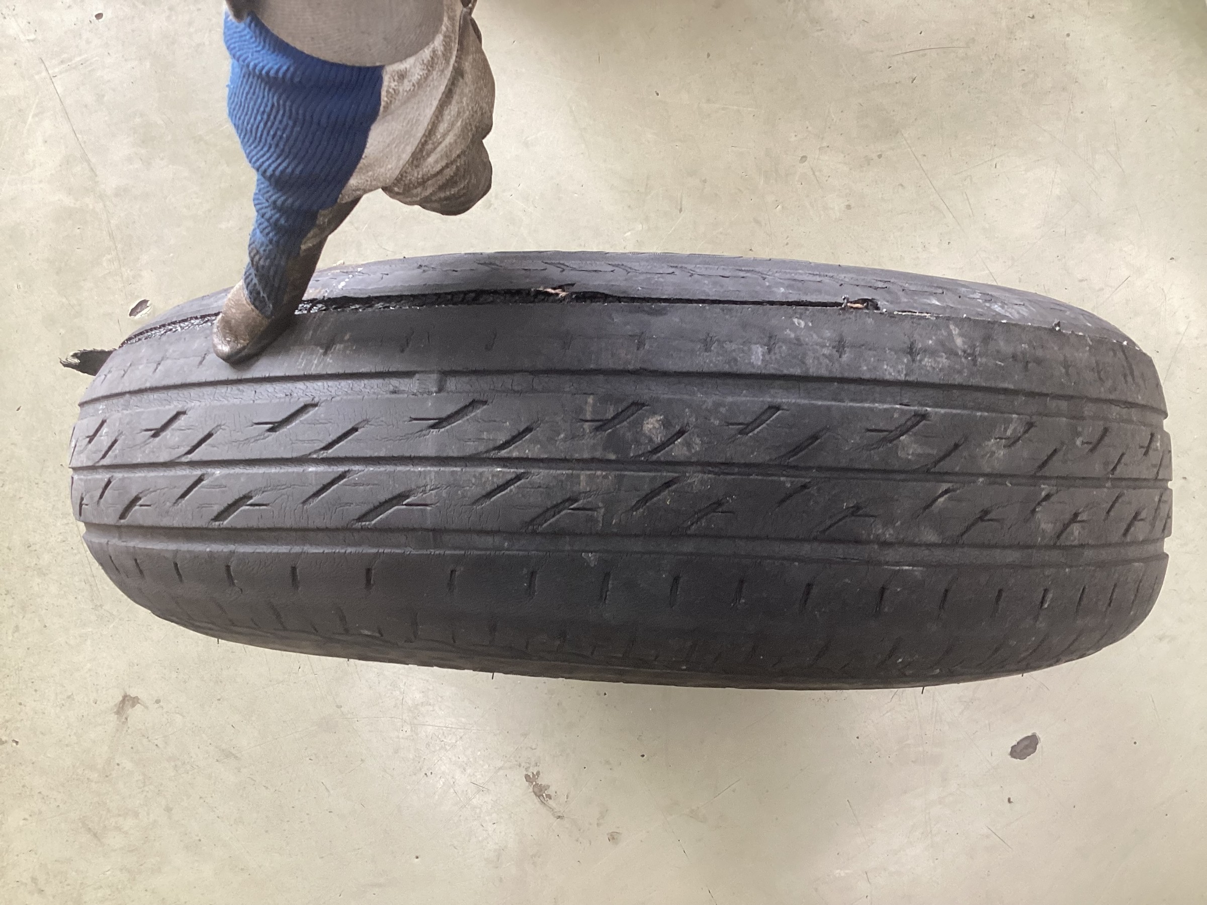 今回持ち込まれたタイヤは、乗用車ではまず見かけないかなりレアでヒドイ状態でしたね(◞‸◟)