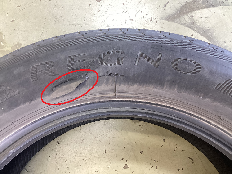 ◆サイドカット 【原因】縁石等にタイヤをヒットさせて、タイヤが破れてしまう現象