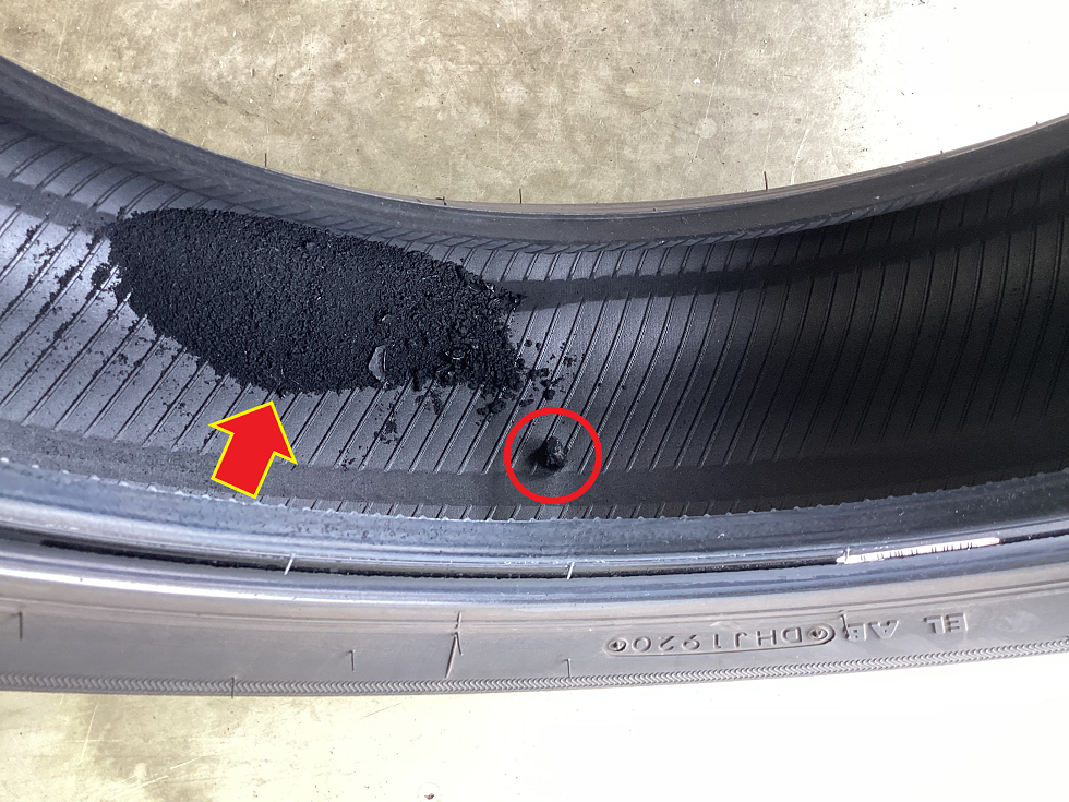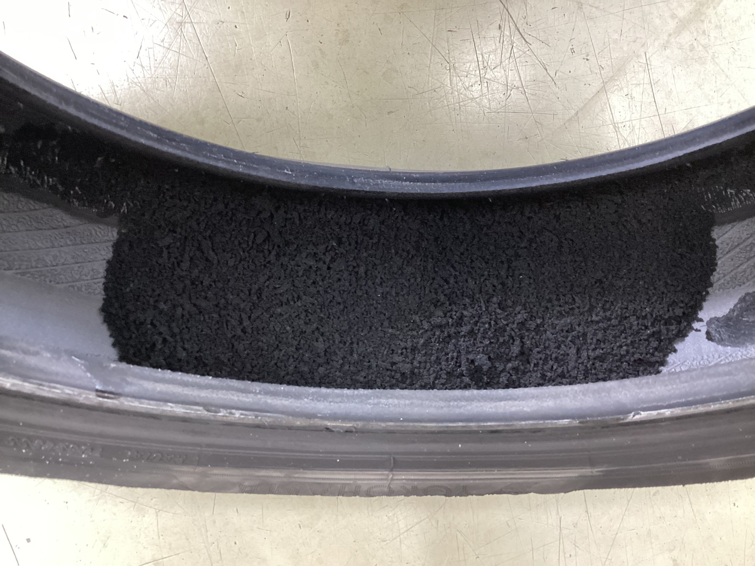 タイヤの中には、低内圧走行で発生したゴムの削り痕が大量に溜まっています・・・