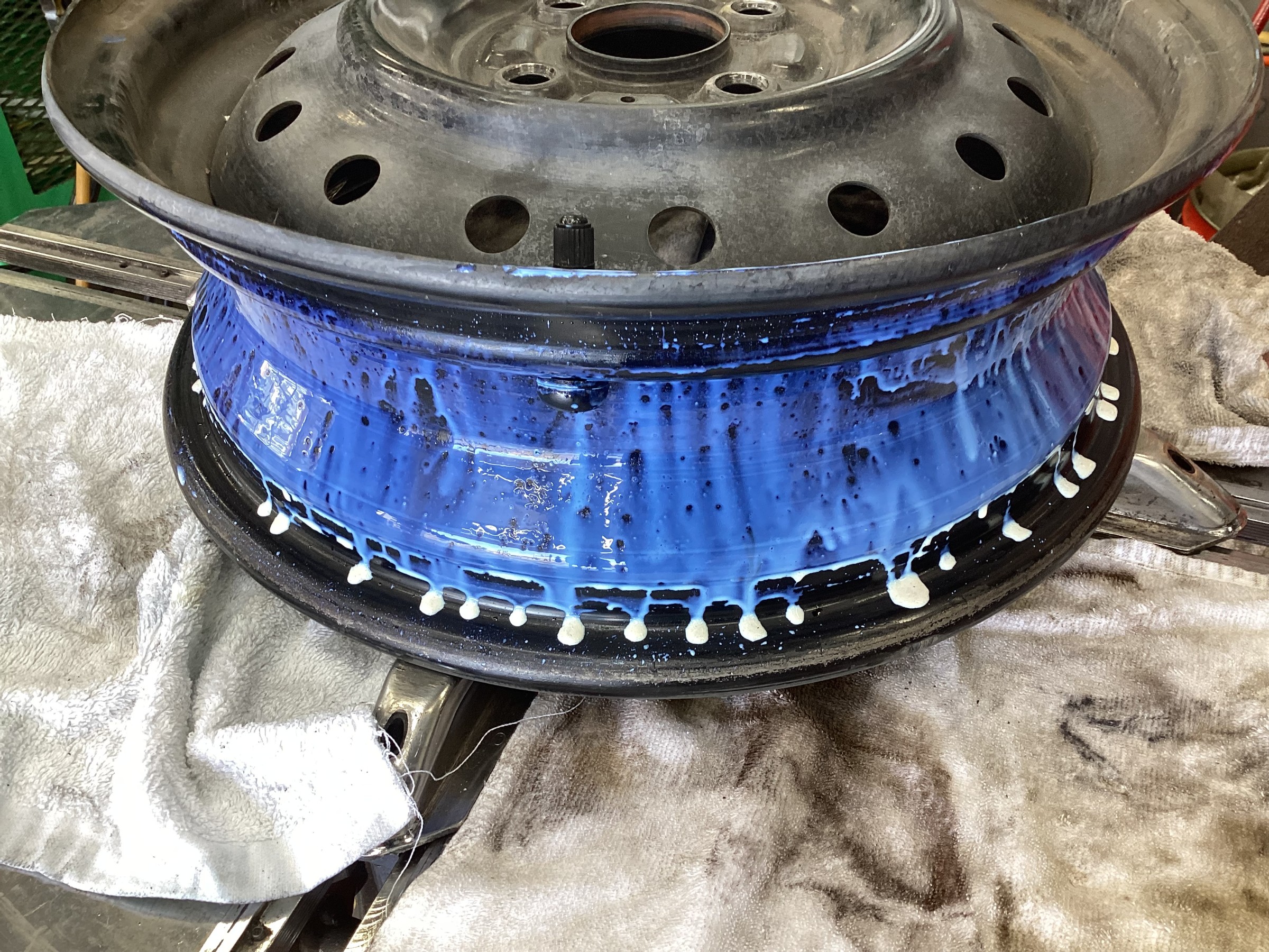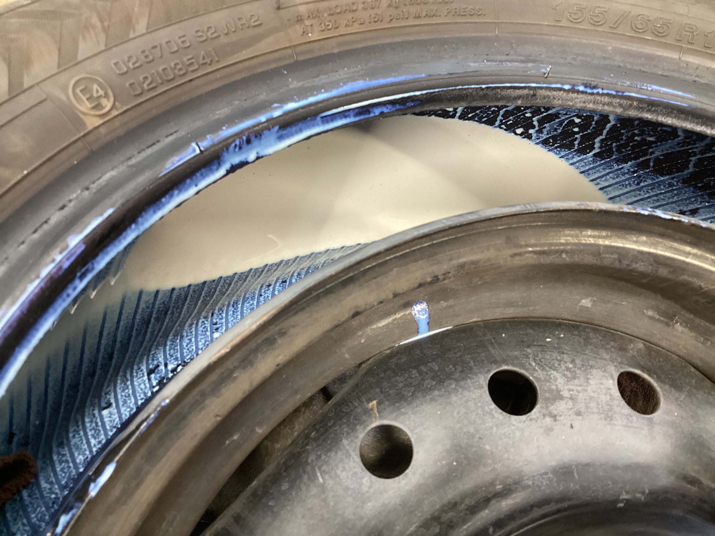 この白い液体が修理剤です!! 注入されるとタイヤ全体に回って穴を塞いでいきます。