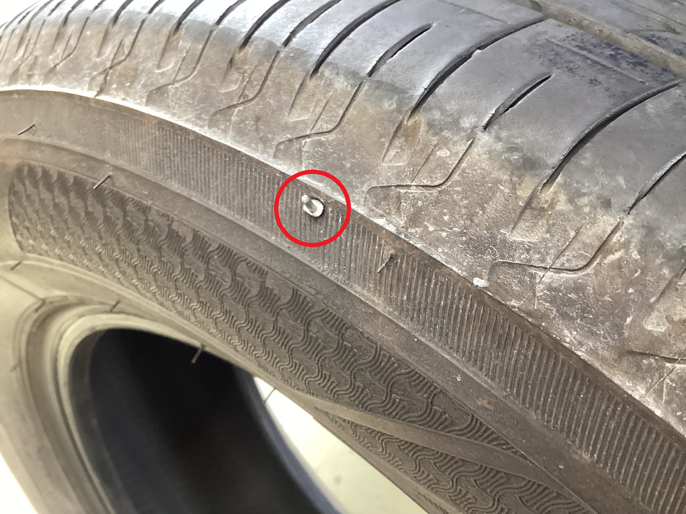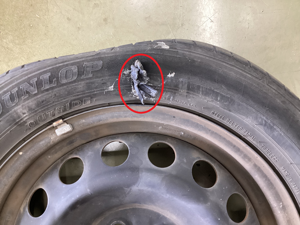 【パンク点検】サイドウォールに異物が刺さって空気が抜けていた為、修理は不可能・・・