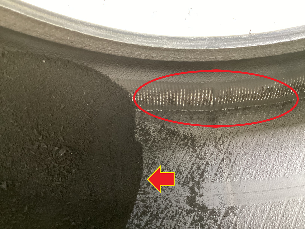 【原因】異物が刺さった状態で走行を続けた為、タイヤ内部を裂傷してしまう現象
